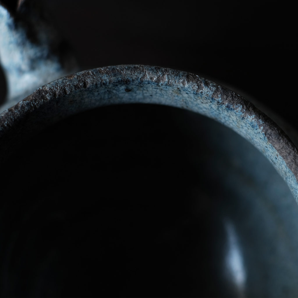 A similar piece is part of the Japan Folk Crafts Museum collection. Some chips are at the tip of the spout, but the cut is likely from kiln damage. Additionally, there are some glaze flakings and chips around the lip, but overall, it is in good condition.