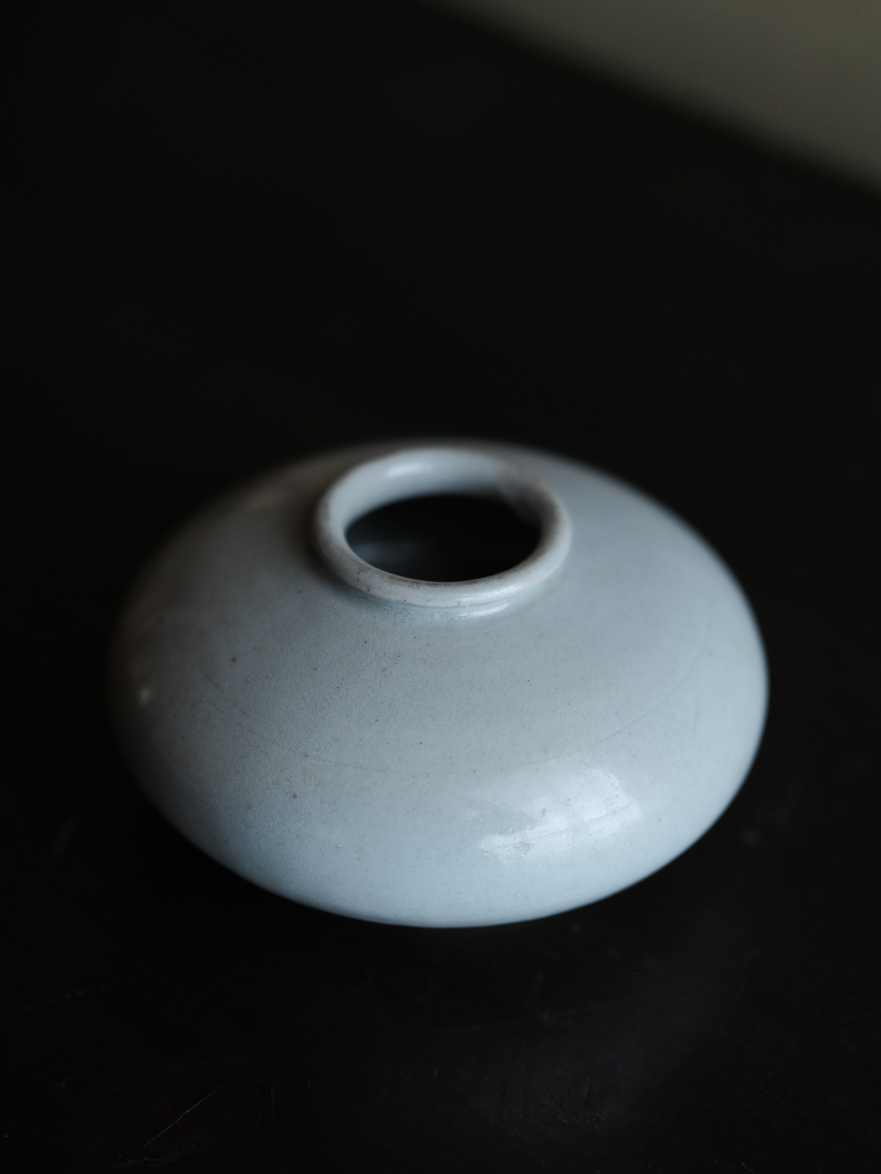 A white porcelain jar from the early Joseon dynasty. The gently rounded mouth rim and traces of fine grits within the foot suggest production at the official Gwangju kilns or a closely related site. Its plump, bead-shaped form conveys a pleasing weight in the hand, while the faintly bluish-white glaze surface is both limpid and pure. A fine example embodying the essence of Joseon white porcelain, it would be well-suited for the casual display of wildflowers as well as a decorative piece.