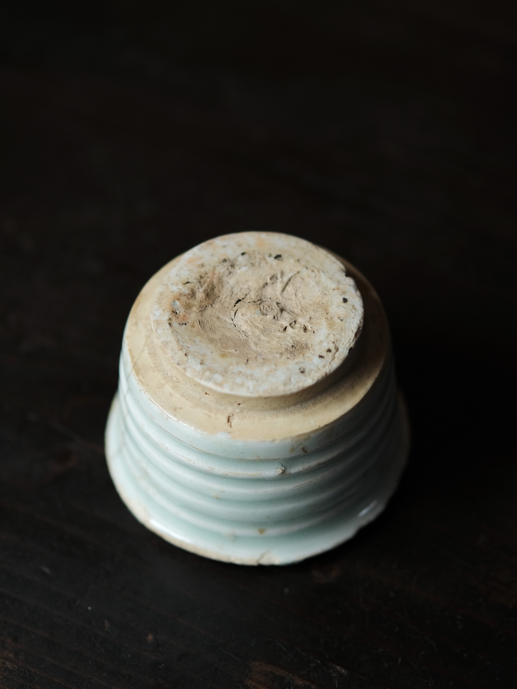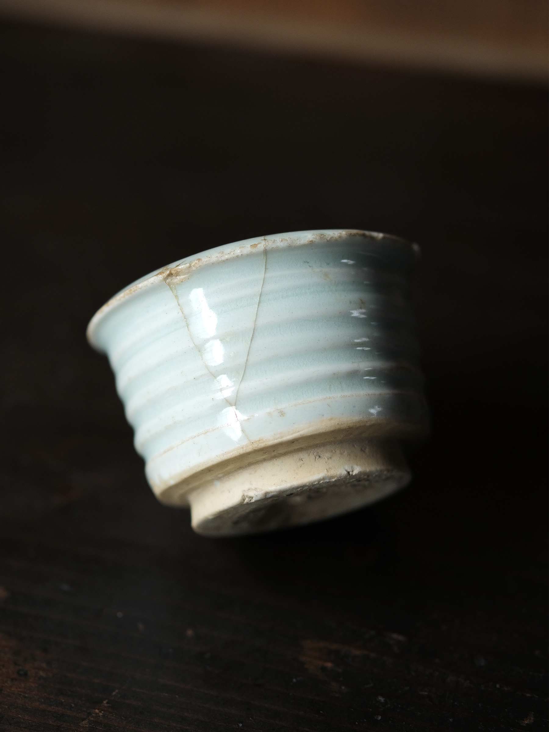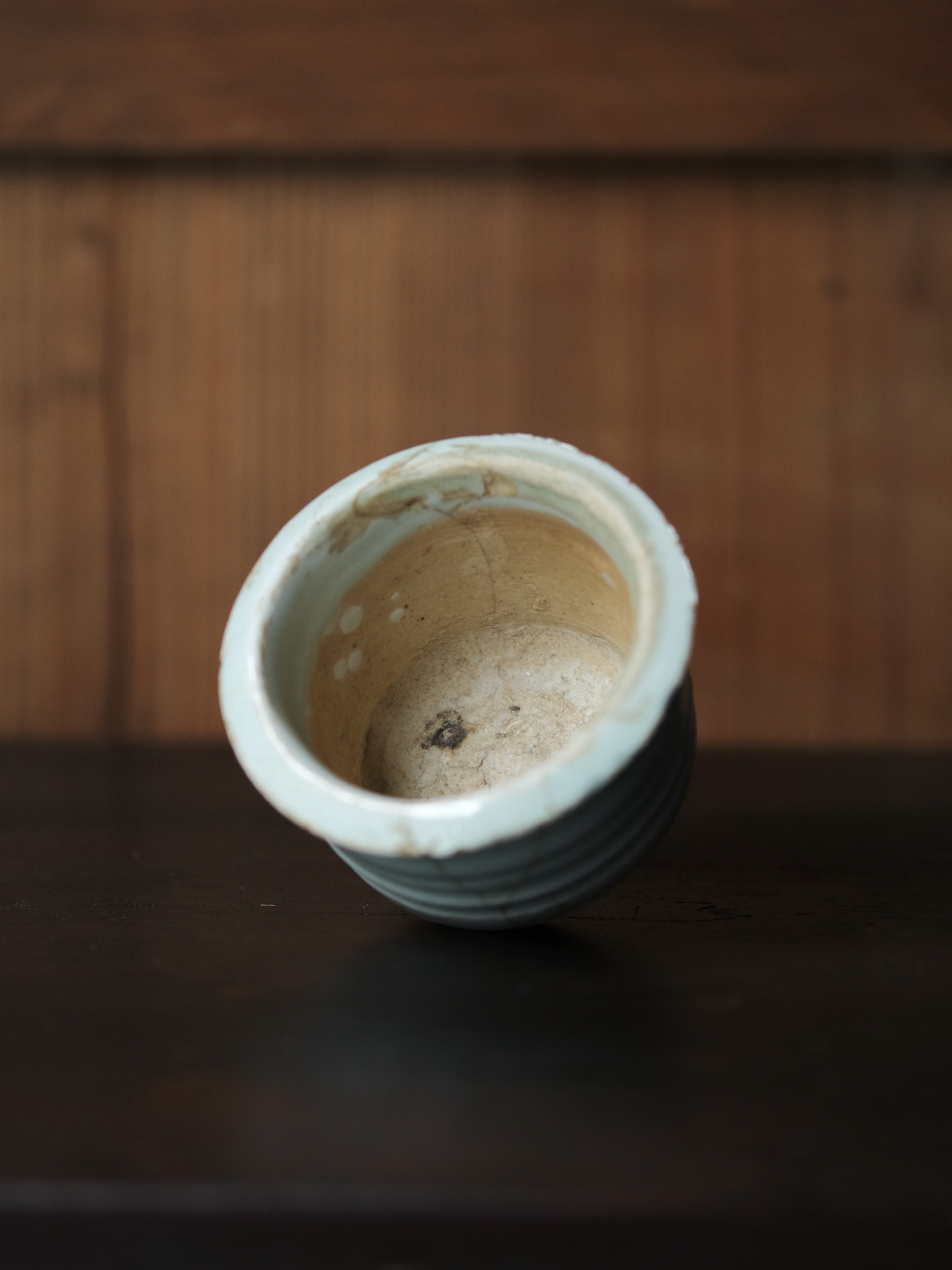 元朝期に焼かれた青白磁の香炉。胴部に四条の溝文がめぐり、口縁は外へ張り出す。底部は中央を僅かに削ったベタ底とし、器体の重心を低く保っている。簡潔にして柔らかなその作行きには、デルフトのクリームポットのような西洋的な趣が漂う。青みの強い滑らかな釉調が、香を焚くという行為にふさわしい澄明な空気を湛えている。