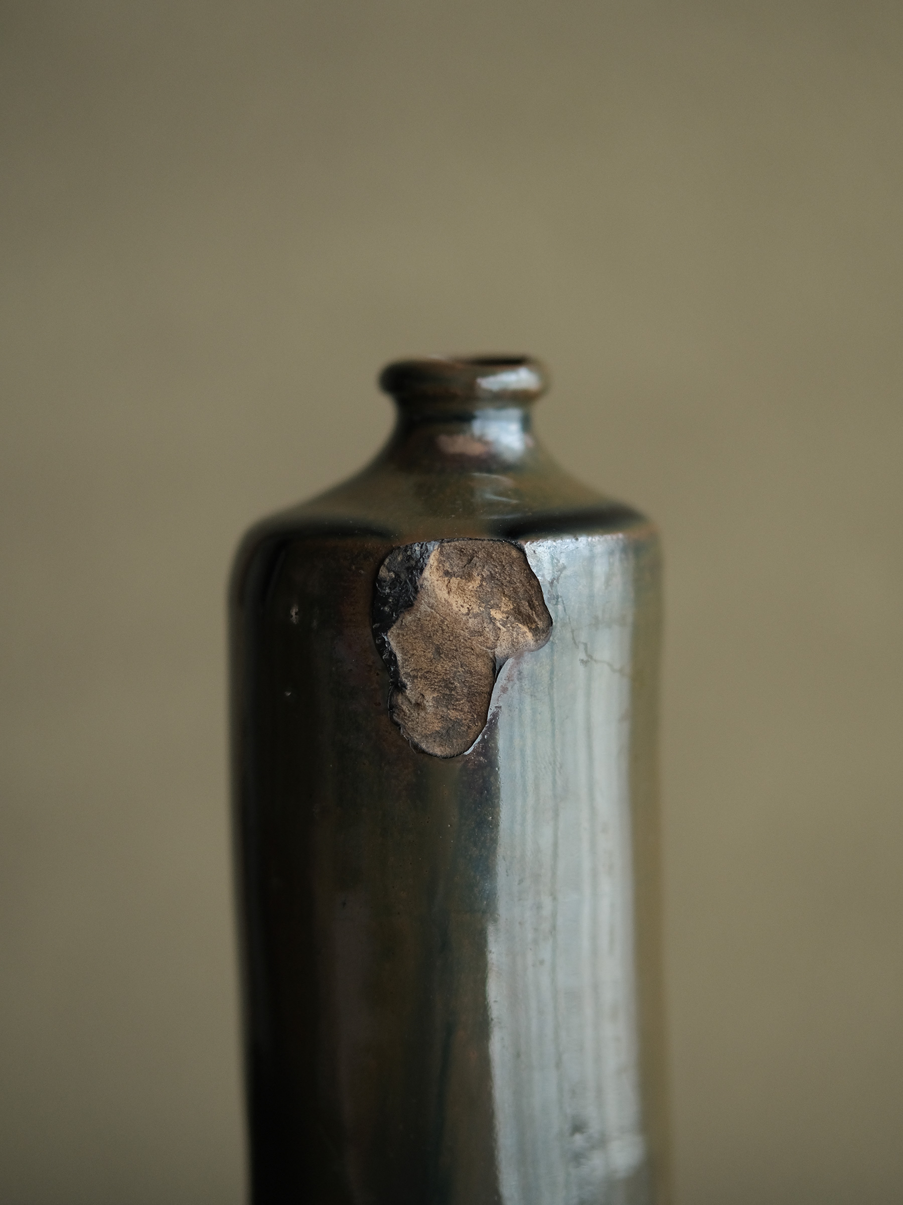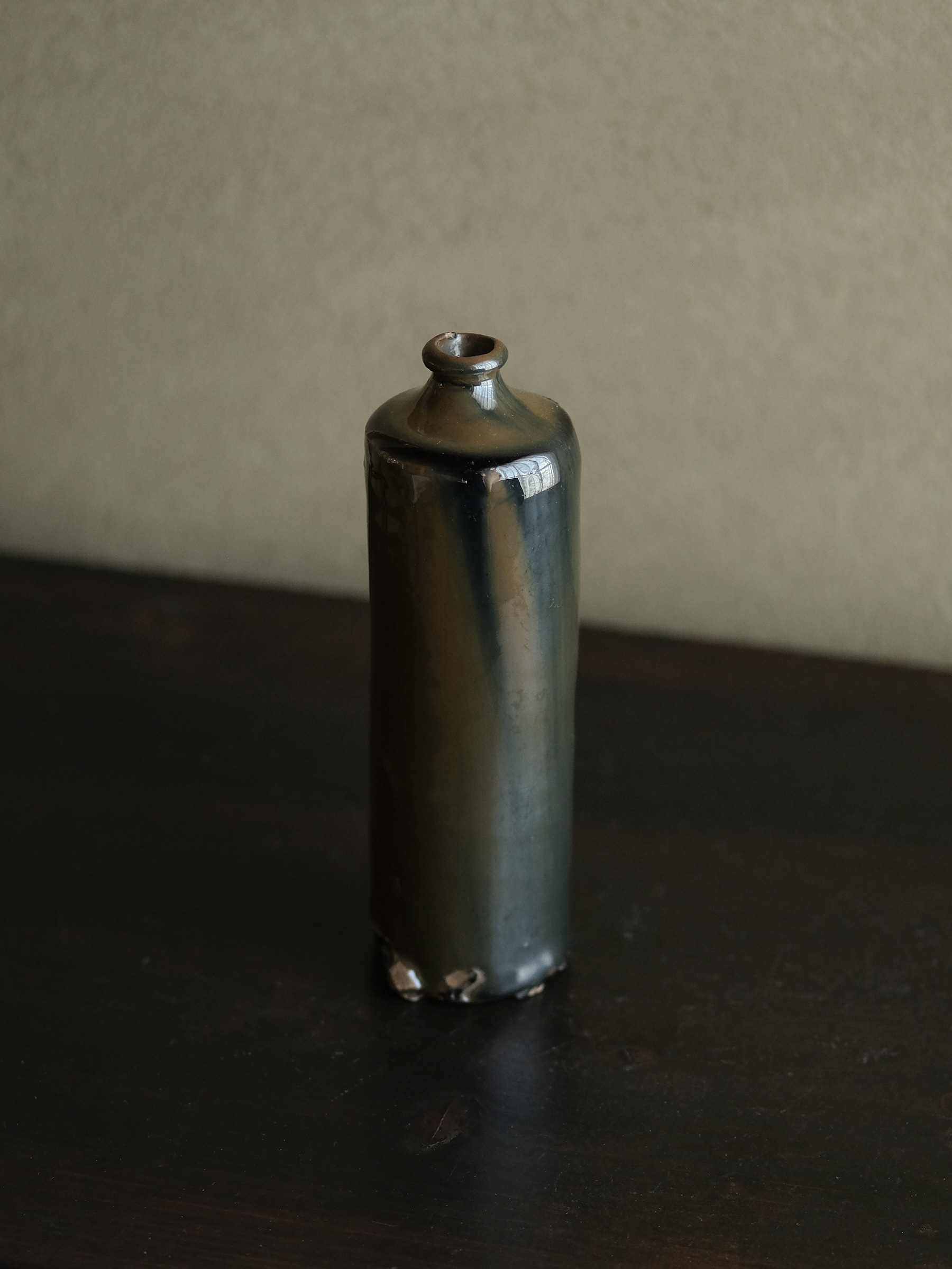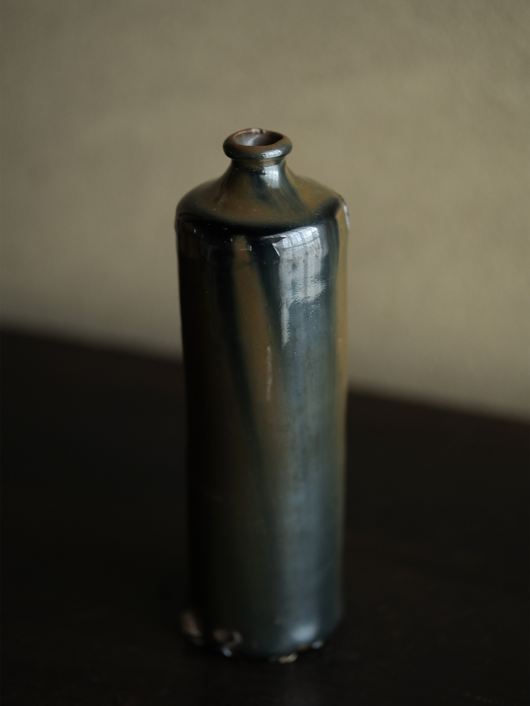 明朝期に磁州窯系の窯で焼かれた天目瓶。輪郭のわずかに歪んだ寸胴を成し、小ぶりな口を備える。磁州窯系の瓶としては珍しく、黒釉が底部脇まで施されており、どこか現代的な佇まいを見せる。器形に沿って褐色が滲み、黒釉の中に溶けゆくさまが美しく、花入れとすれば空間にひそやかな陰翳をもたらすだろう。