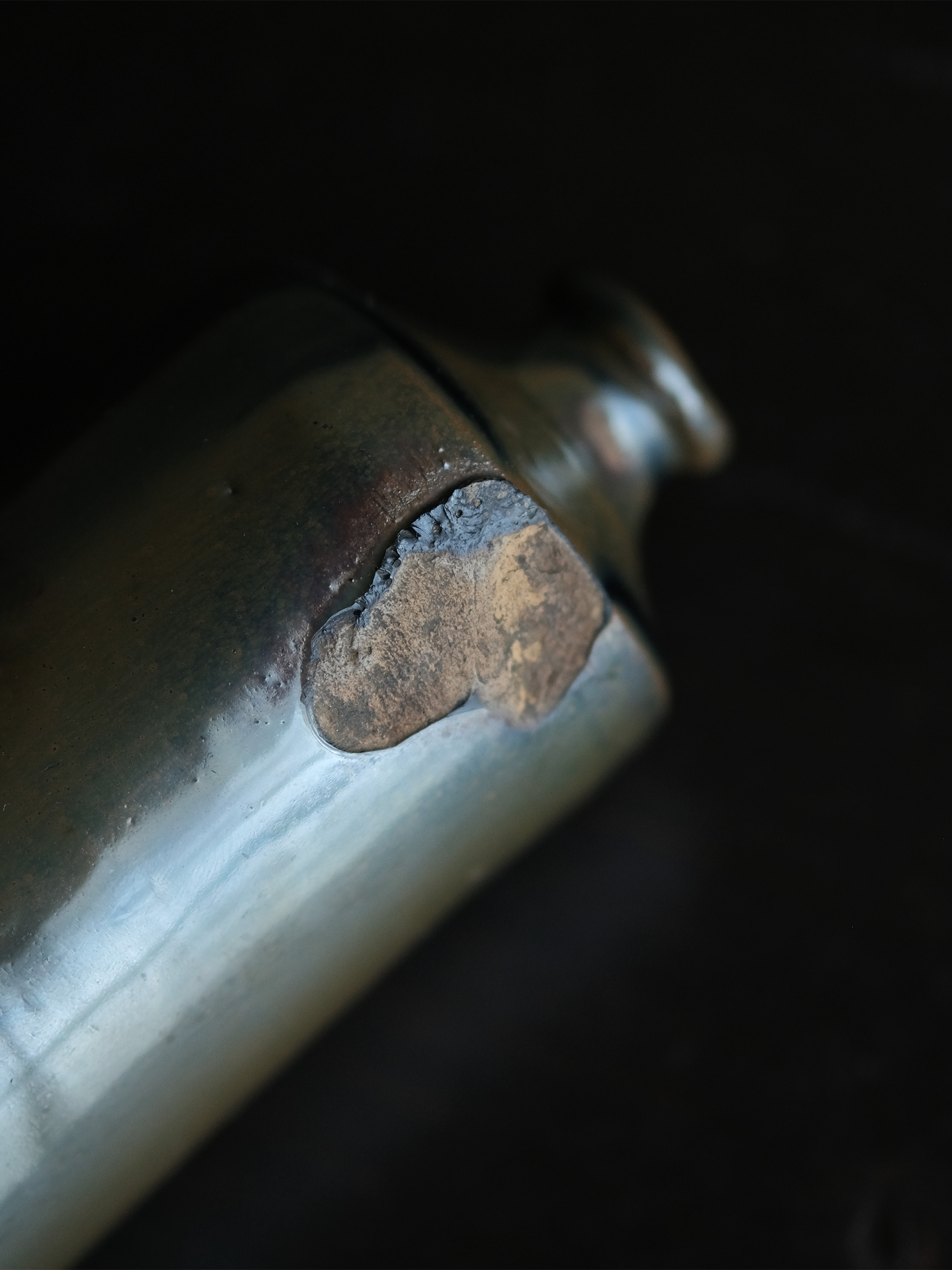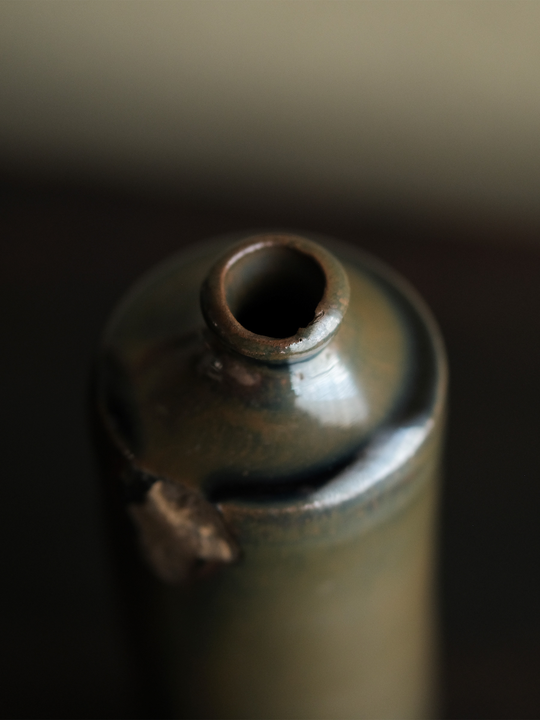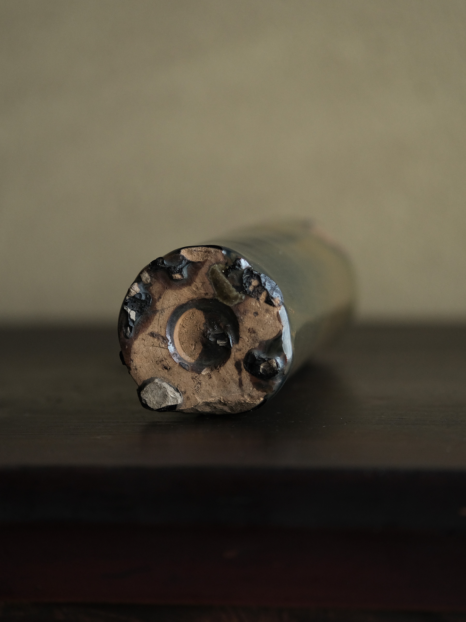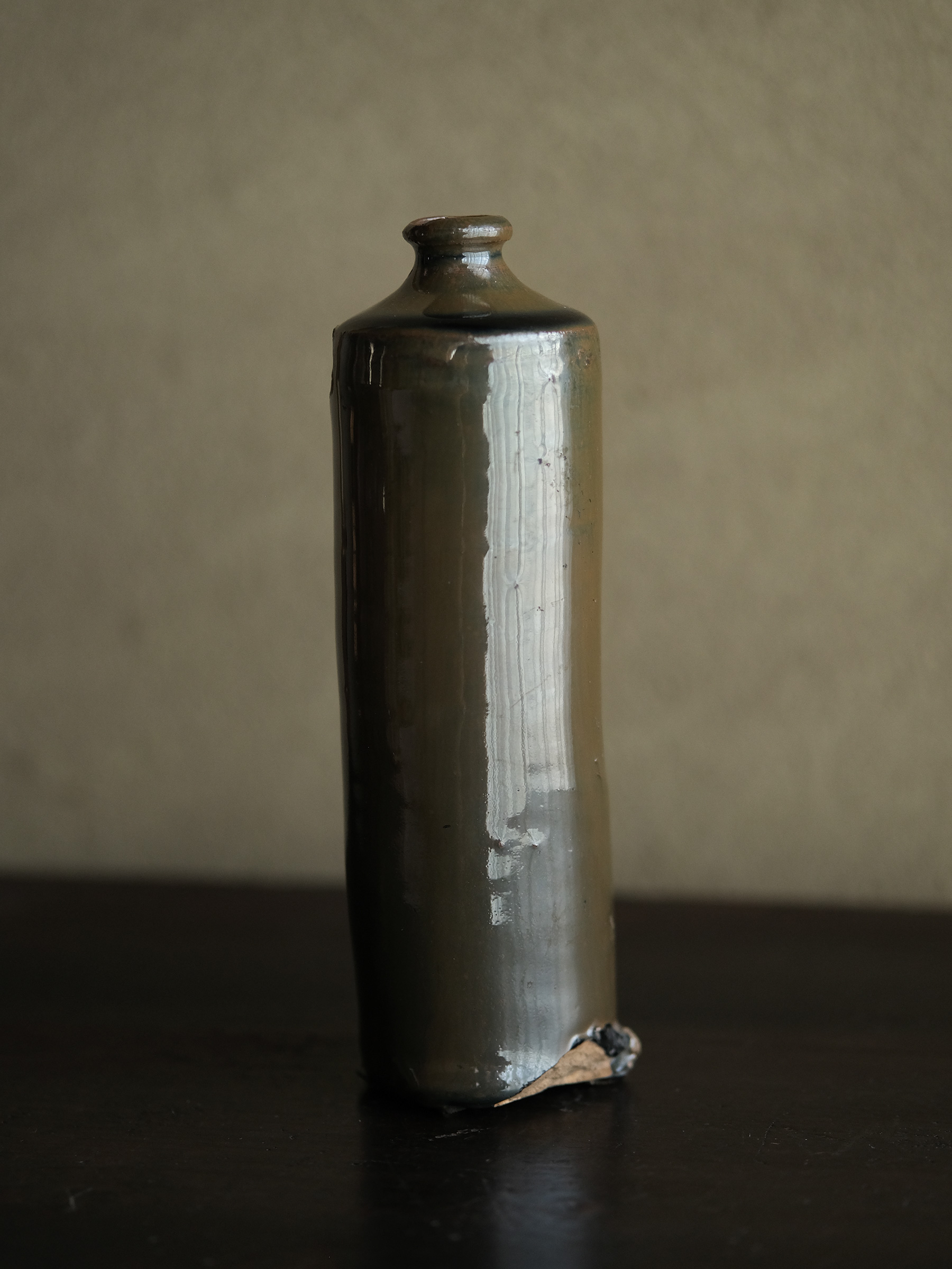 明朝期に磁州窯系の窯で焼かれた天目瓶。輪郭のわずかに歪んだ寸胴を成し、小ぶりな口を備える。磁州窯系の瓶としては珍しく、黒釉が底部脇まで施されており、どこか現代的な佇まいを見せる。器形に沿って褐色が滲み、黒釉の中に溶けゆくさまが美しく、花入れとすれば空間にひそやかな陰翳をもたらすだろう。