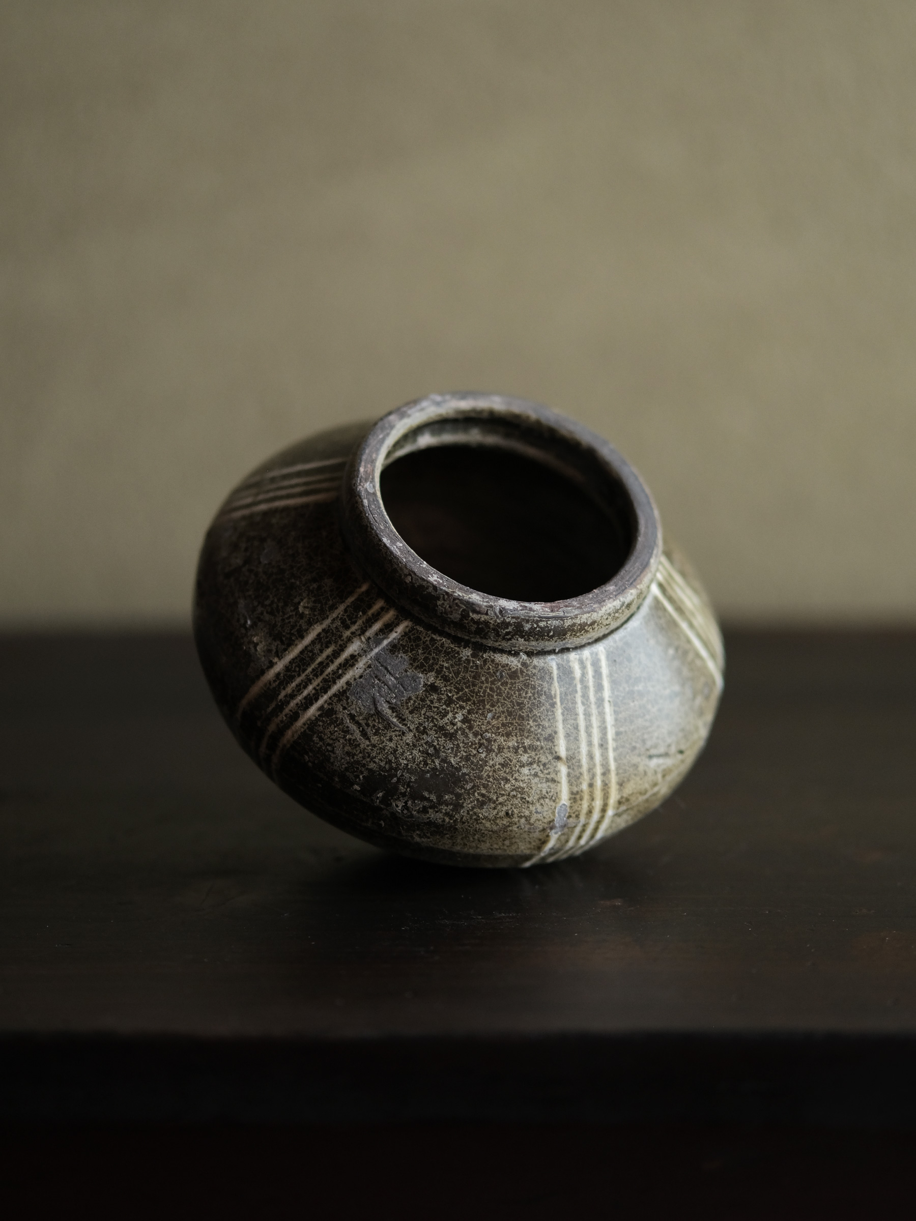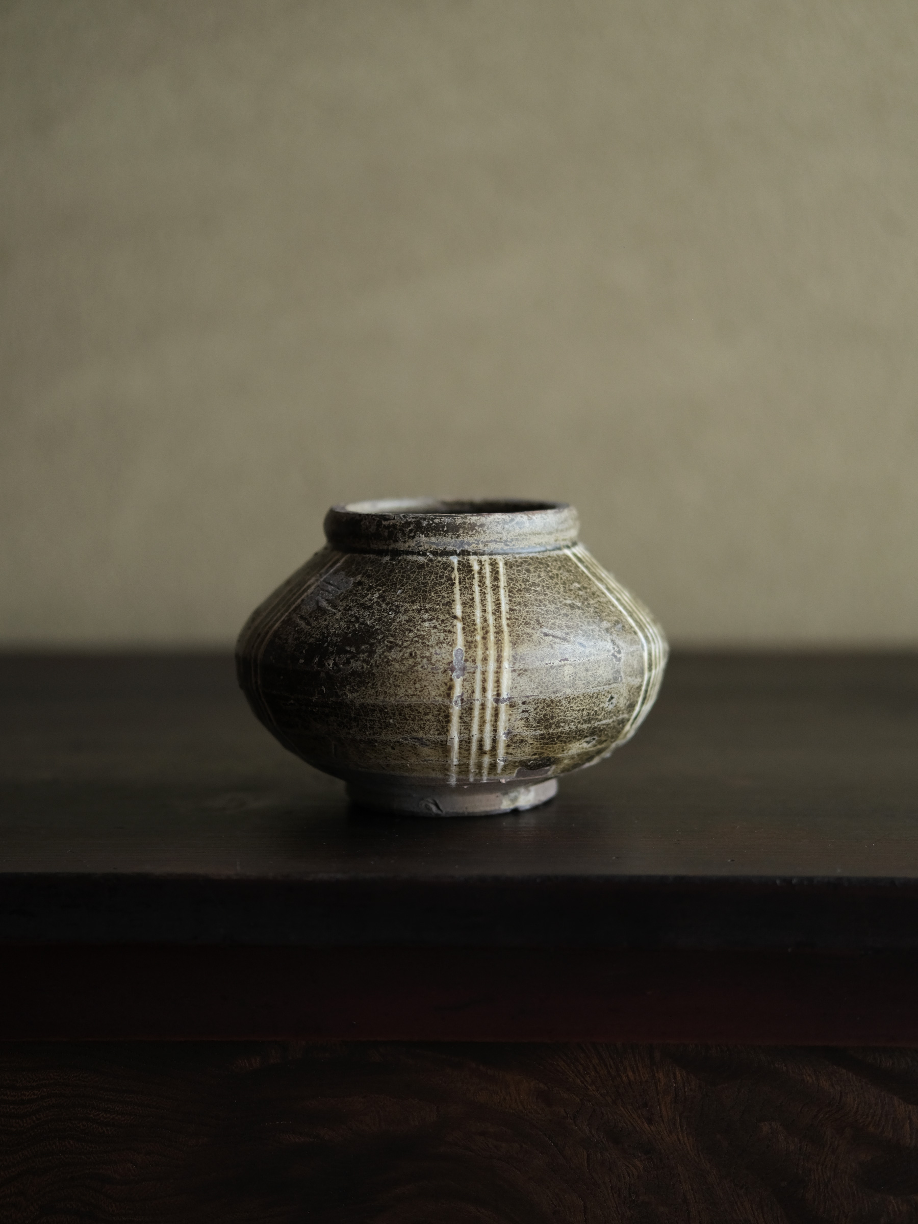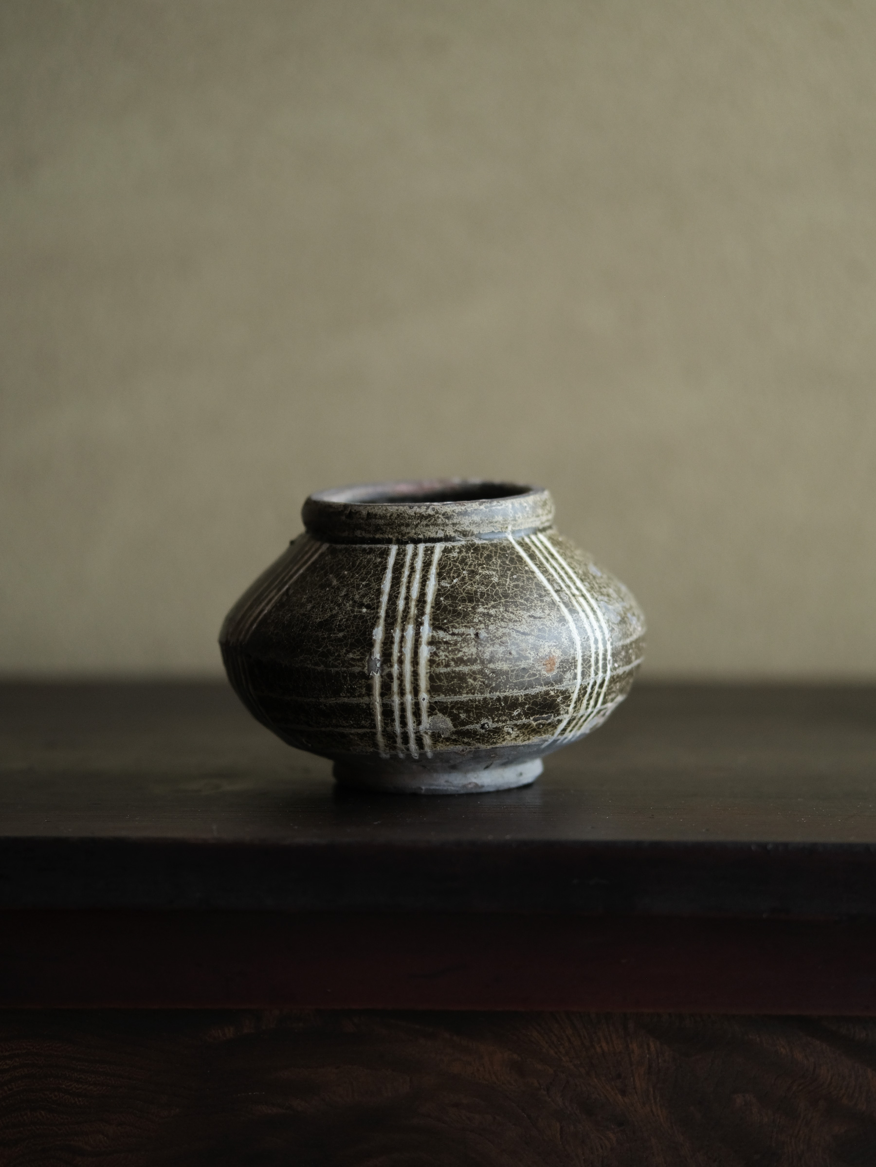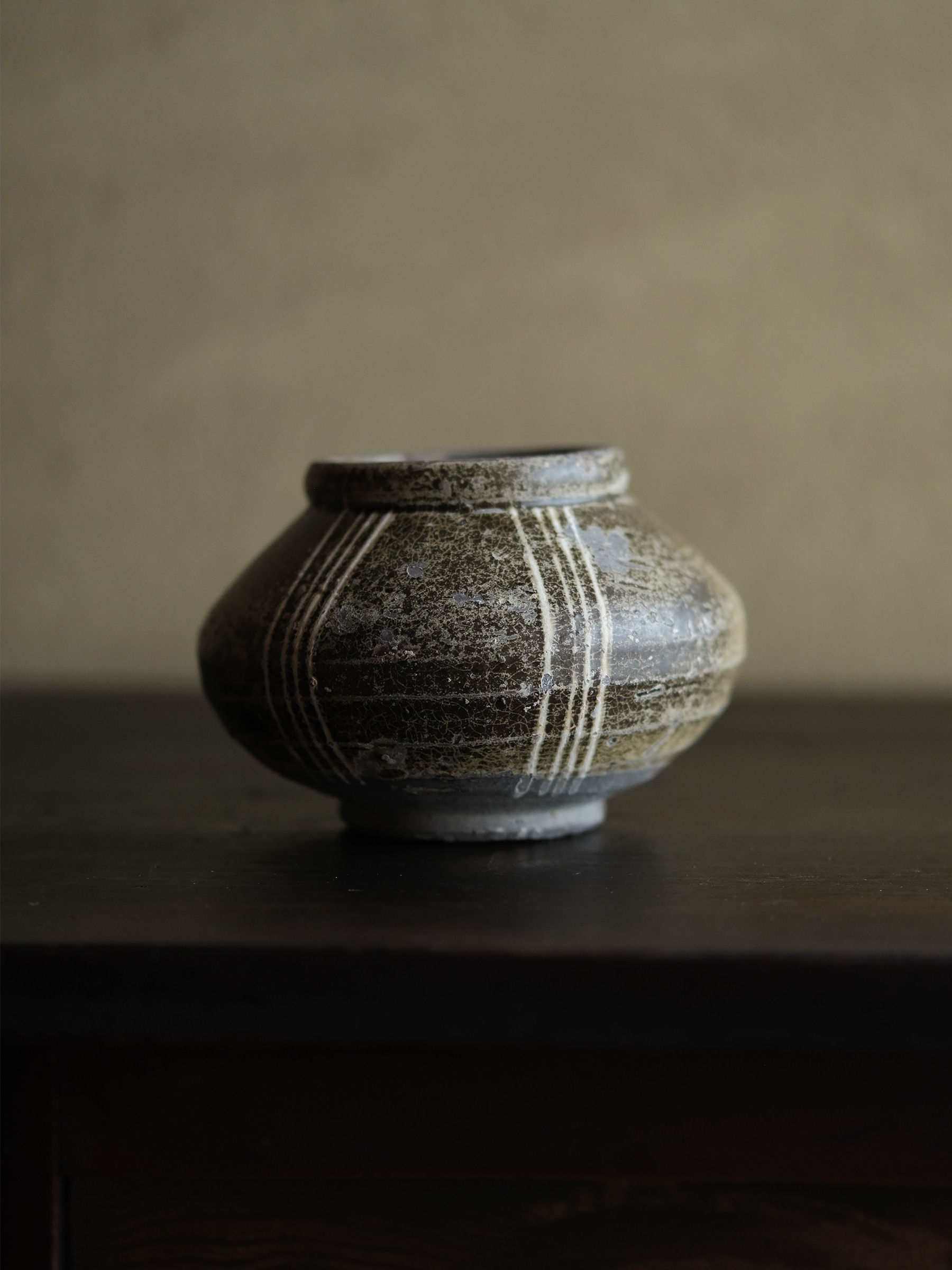南宋期に四川成都平原の邛窯で焼かれた小壺。胴の張った算盤玉形を成し、褐釉を腰部まで掛け、胴部には白泥で「四道杠」と呼ばれる四本線をめぐらす。黒みを帯びた露胎部は焼成時の炭化によるもので、同窯の作品に共通して見られる。
