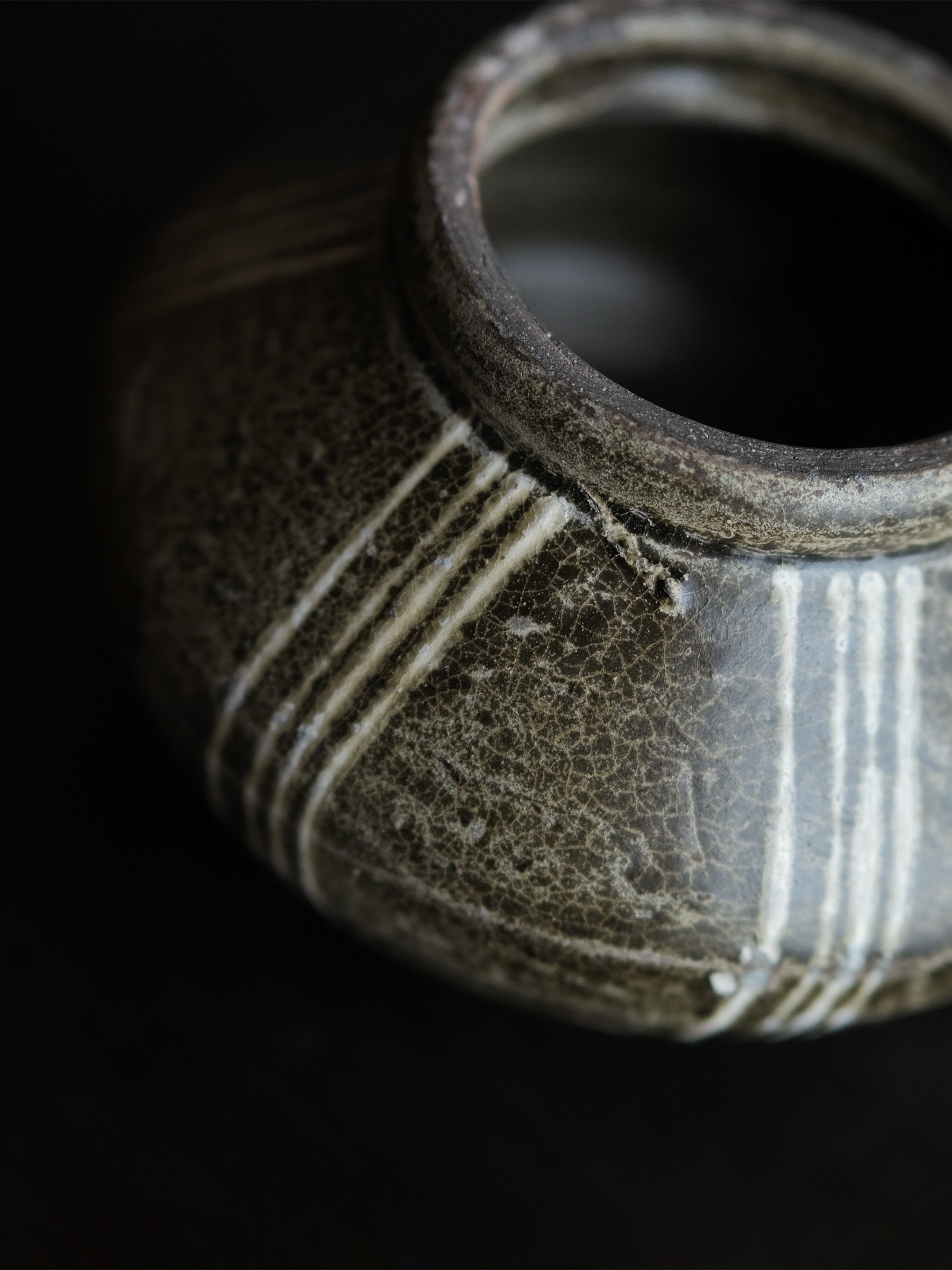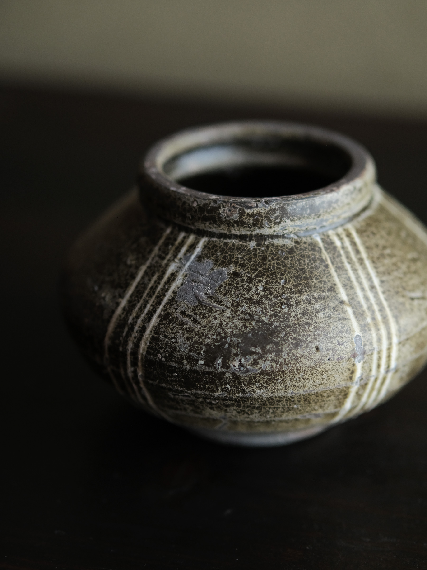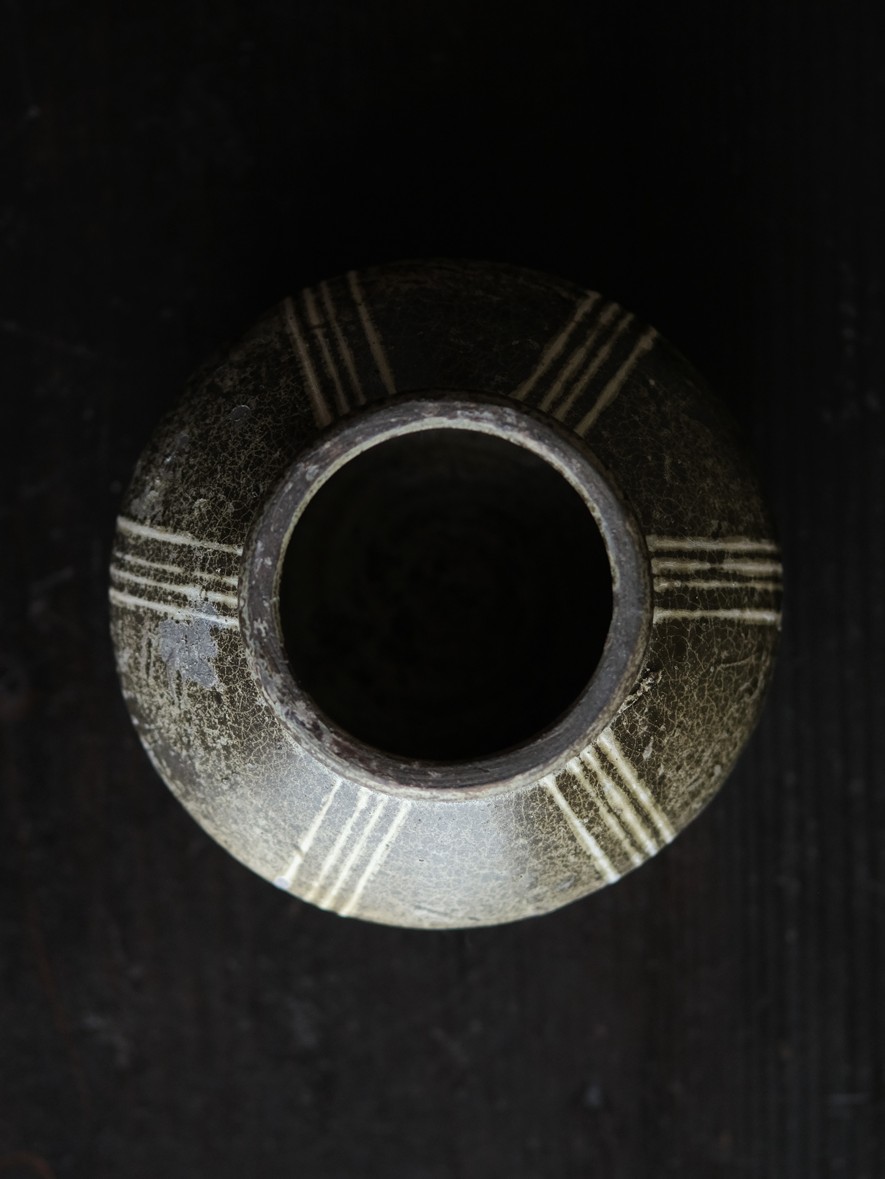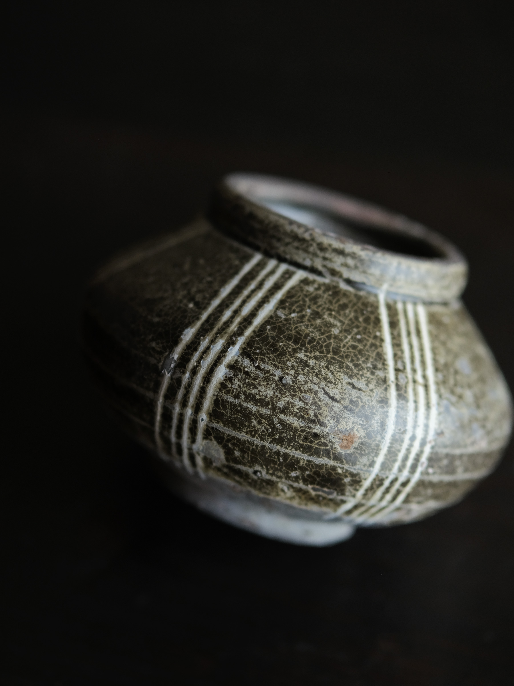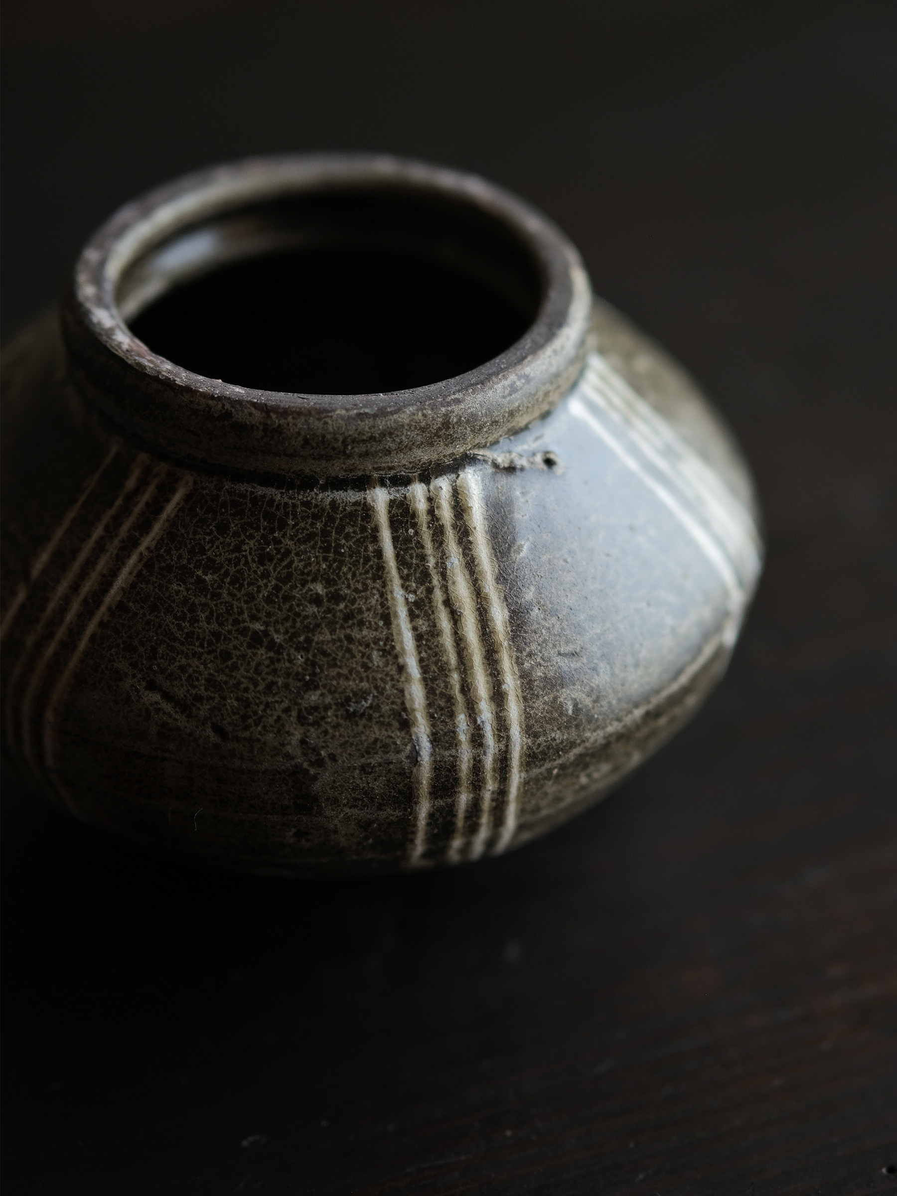 南宋期に四川成都平原の邛窯で焼かれた小壺。胴の張った算盤玉形を成し、褐釉を腰部まで掛け、胴部には白泥で「四道杠」と呼ばれる四本線をめぐらす。黒みを帯びた露胎部は焼成時の炭化によるもので、同窯の作品に共通して見られる。