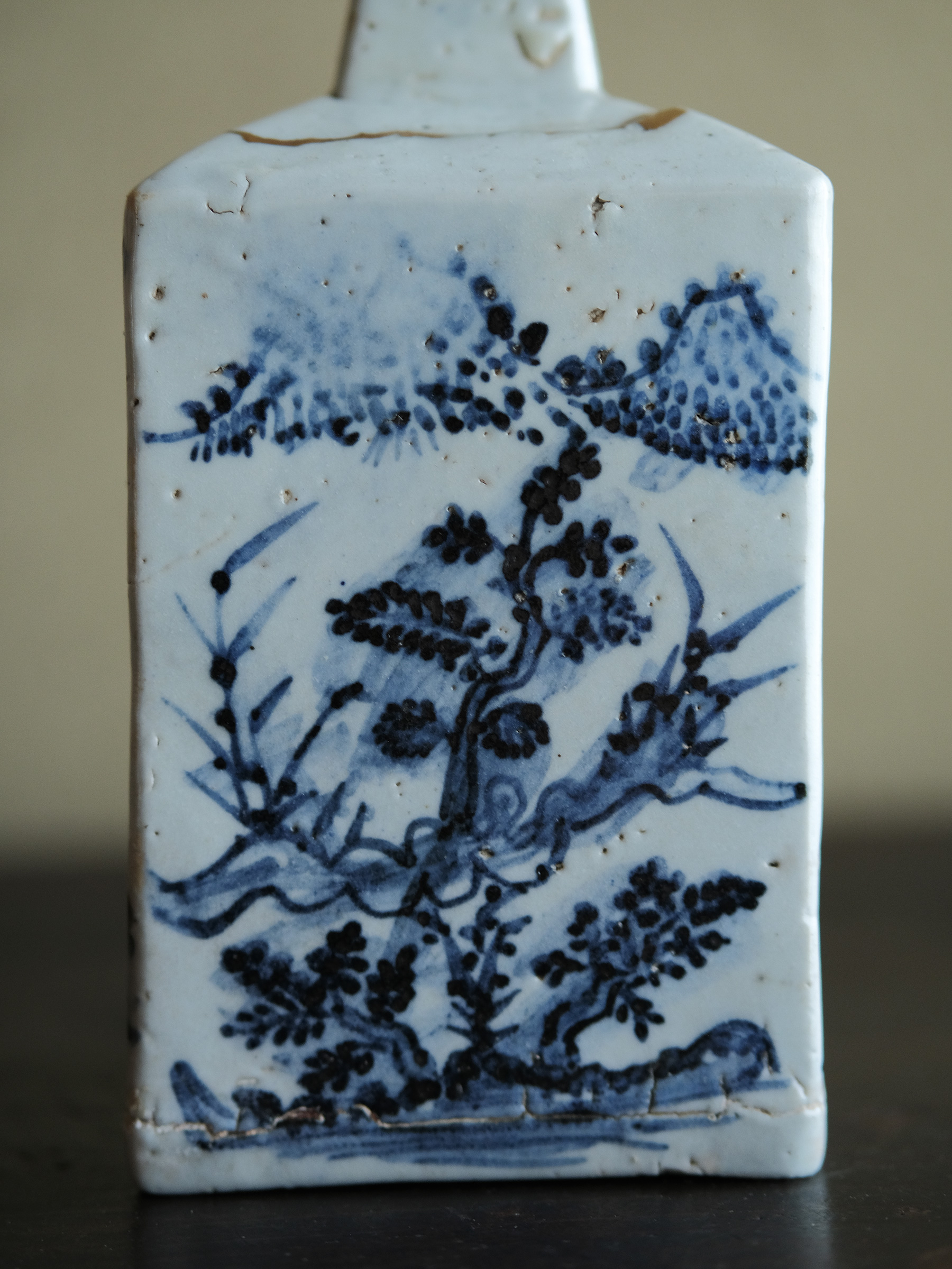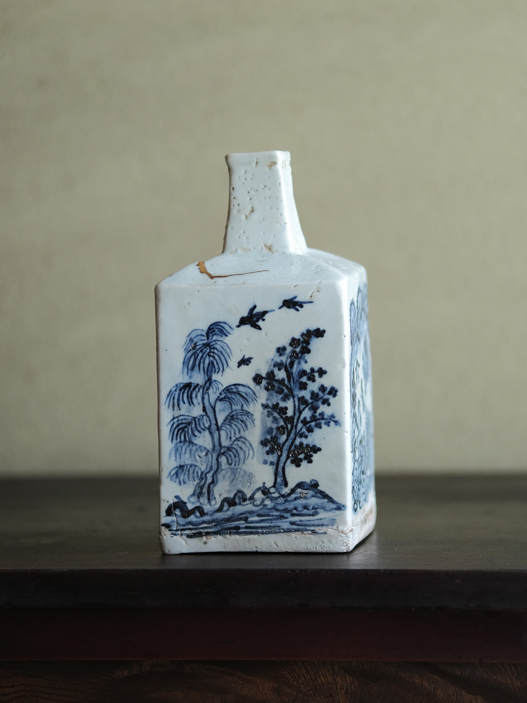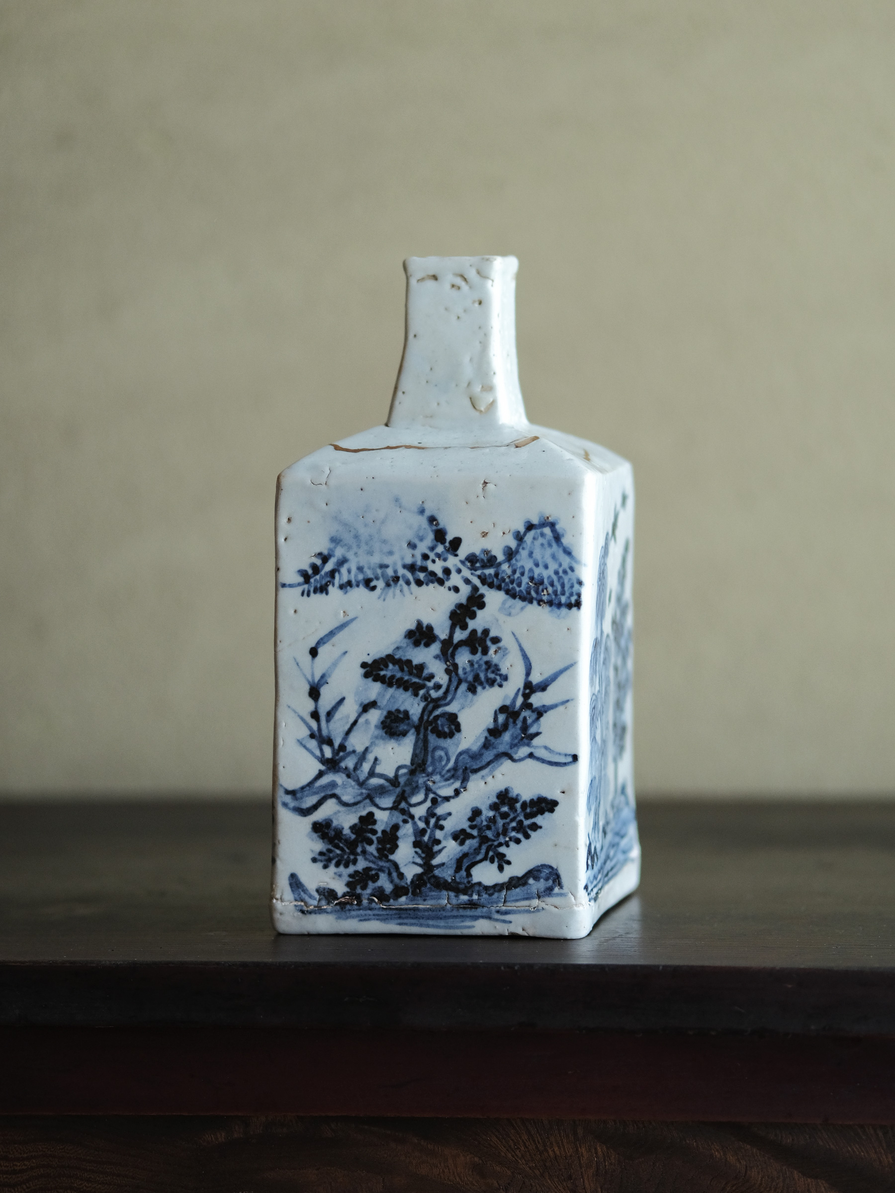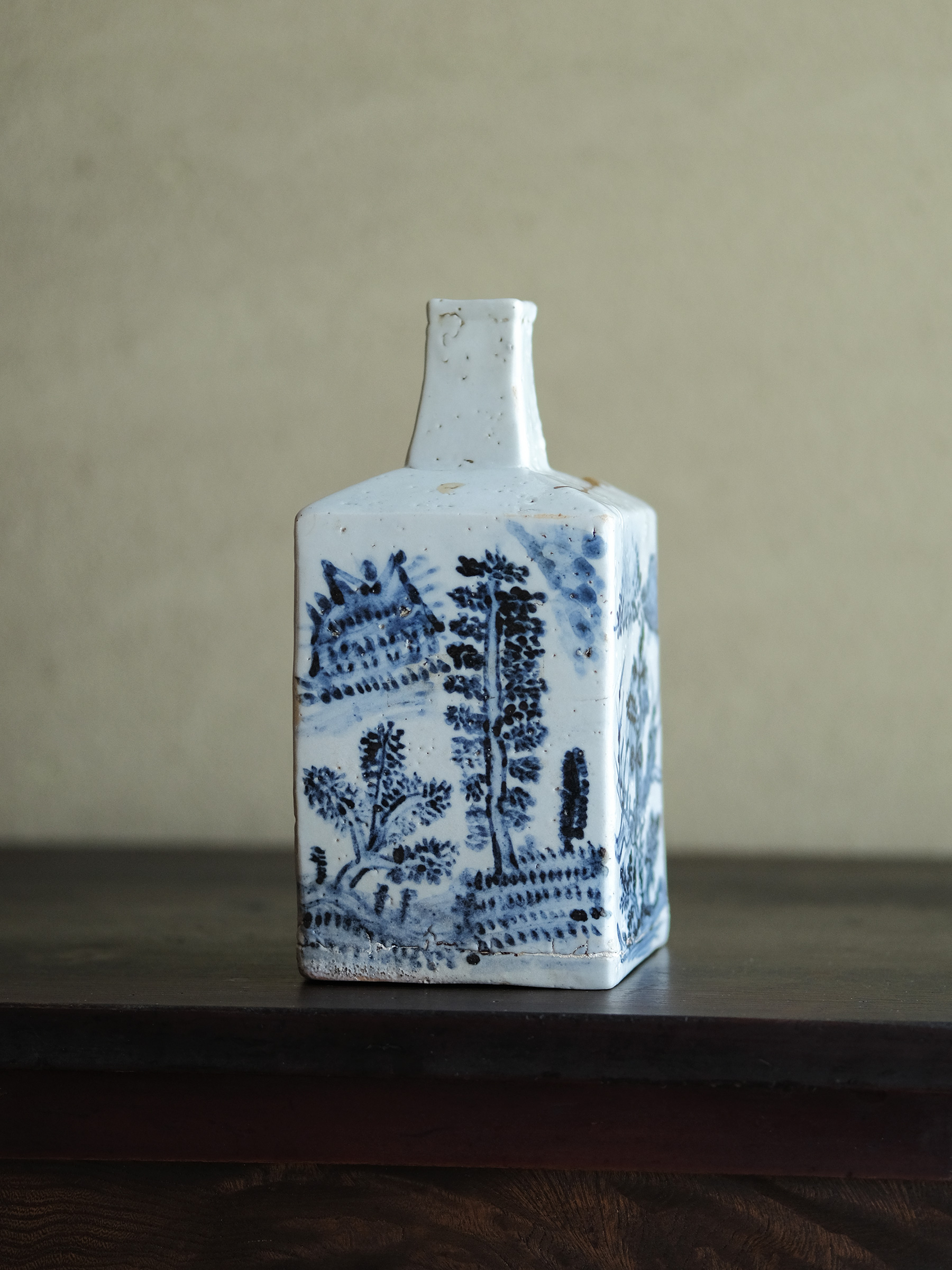 李氏朝鮮時代後期、地方窯で焼かれた青花の角瓶。柳・梅・松・蘭、そして人物を配した山水図が四面に展開され、角瓶という造形を最大限に活かした、巻き絵的な構成となっている。