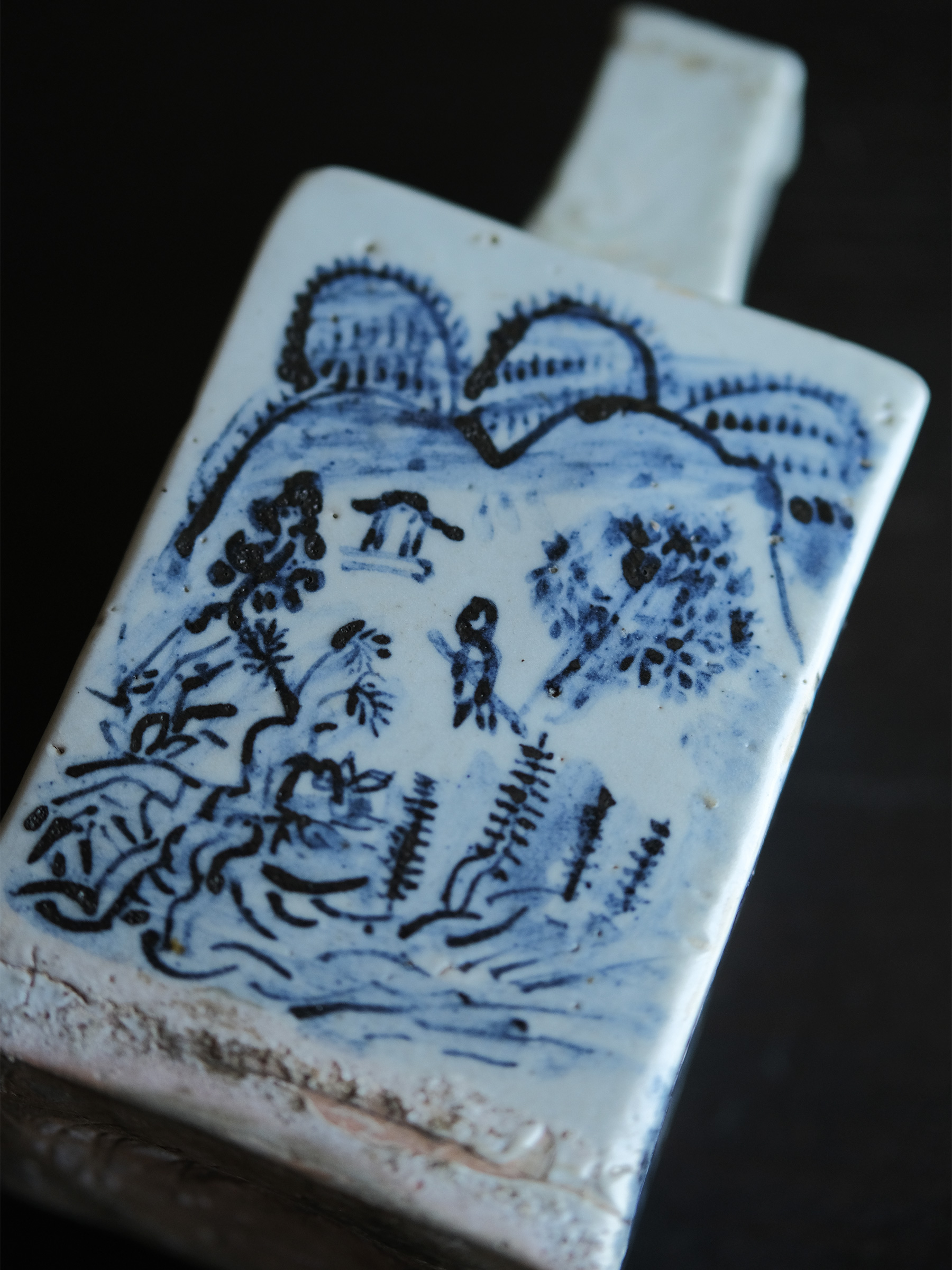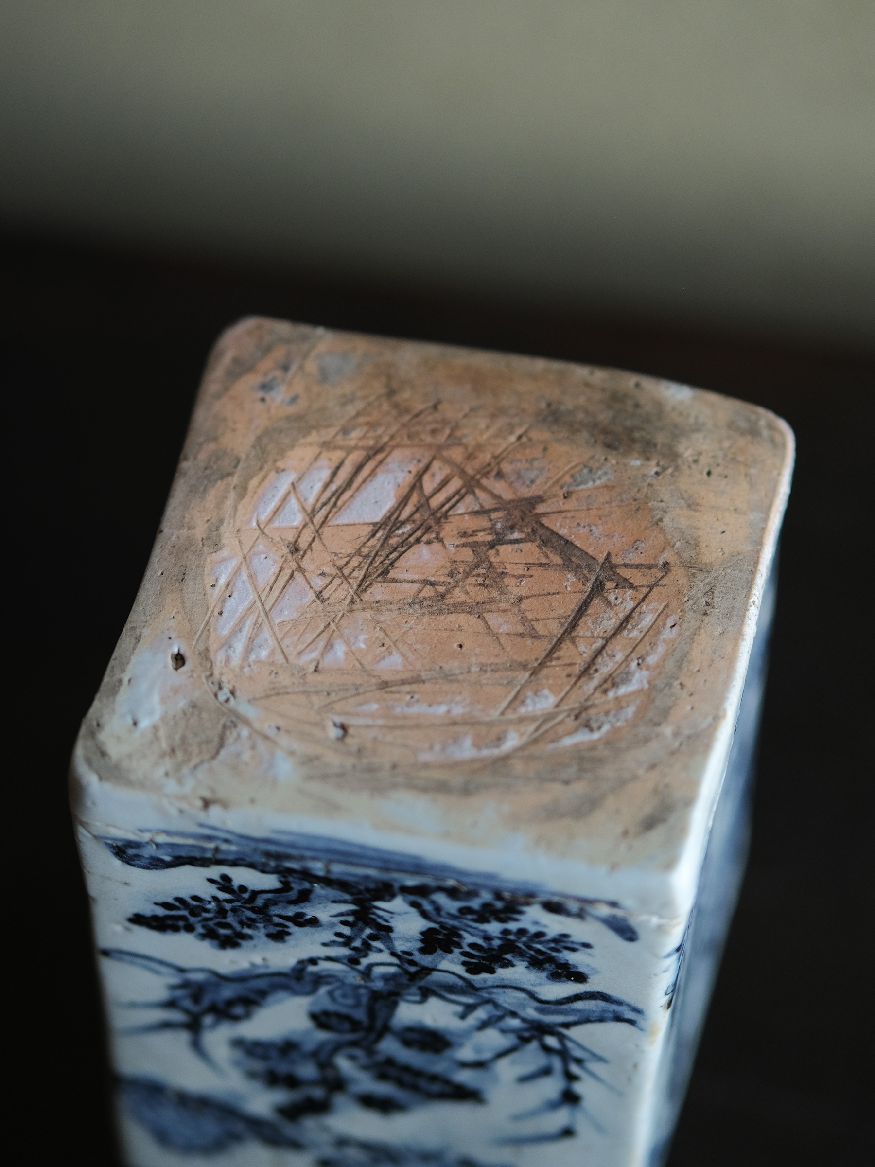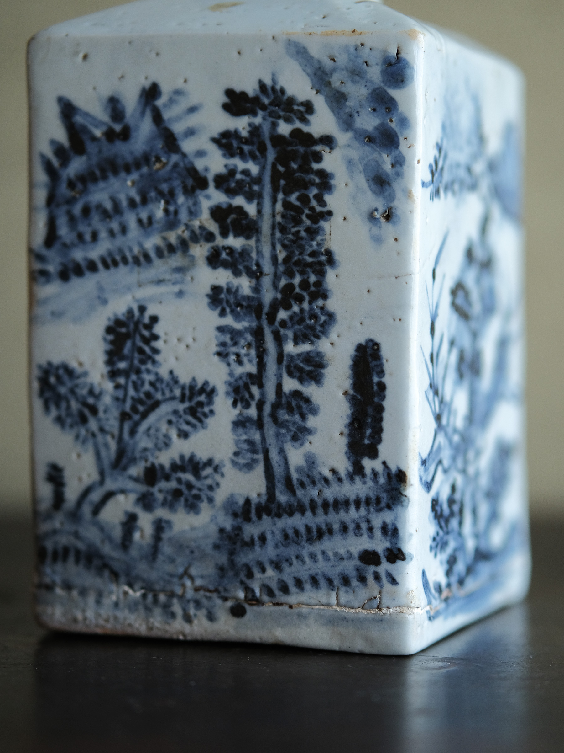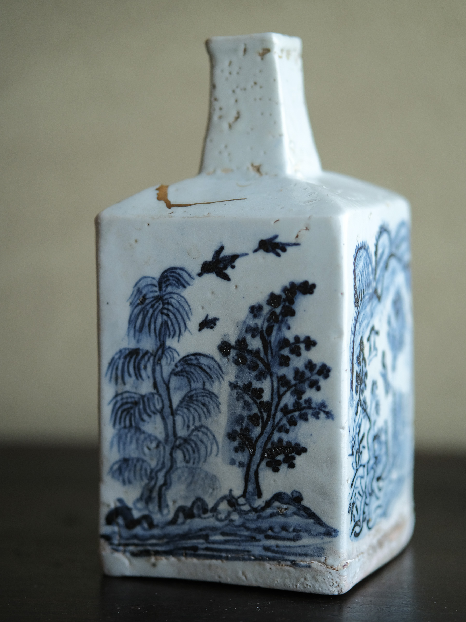 李氏朝鮮時代後期、地方窯で焼かれた青花の角瓶。柳・梅・松・蘭、そして人物を配した山水図が四面に展開され、角瓶という造形を最大限に活かした、巻き絵的な構成となっている。