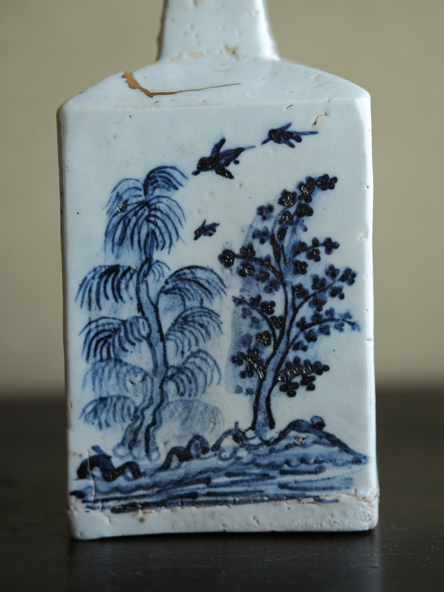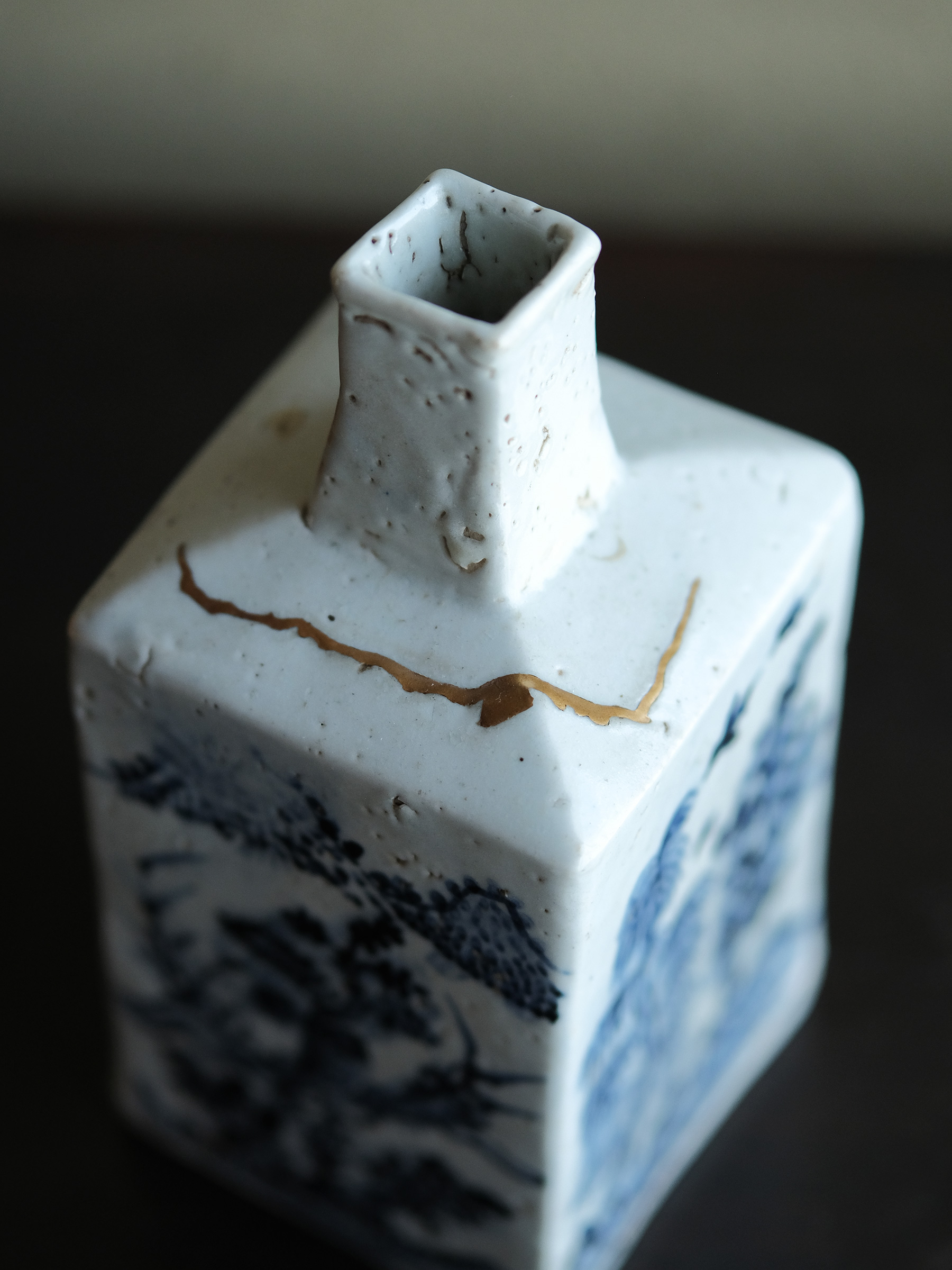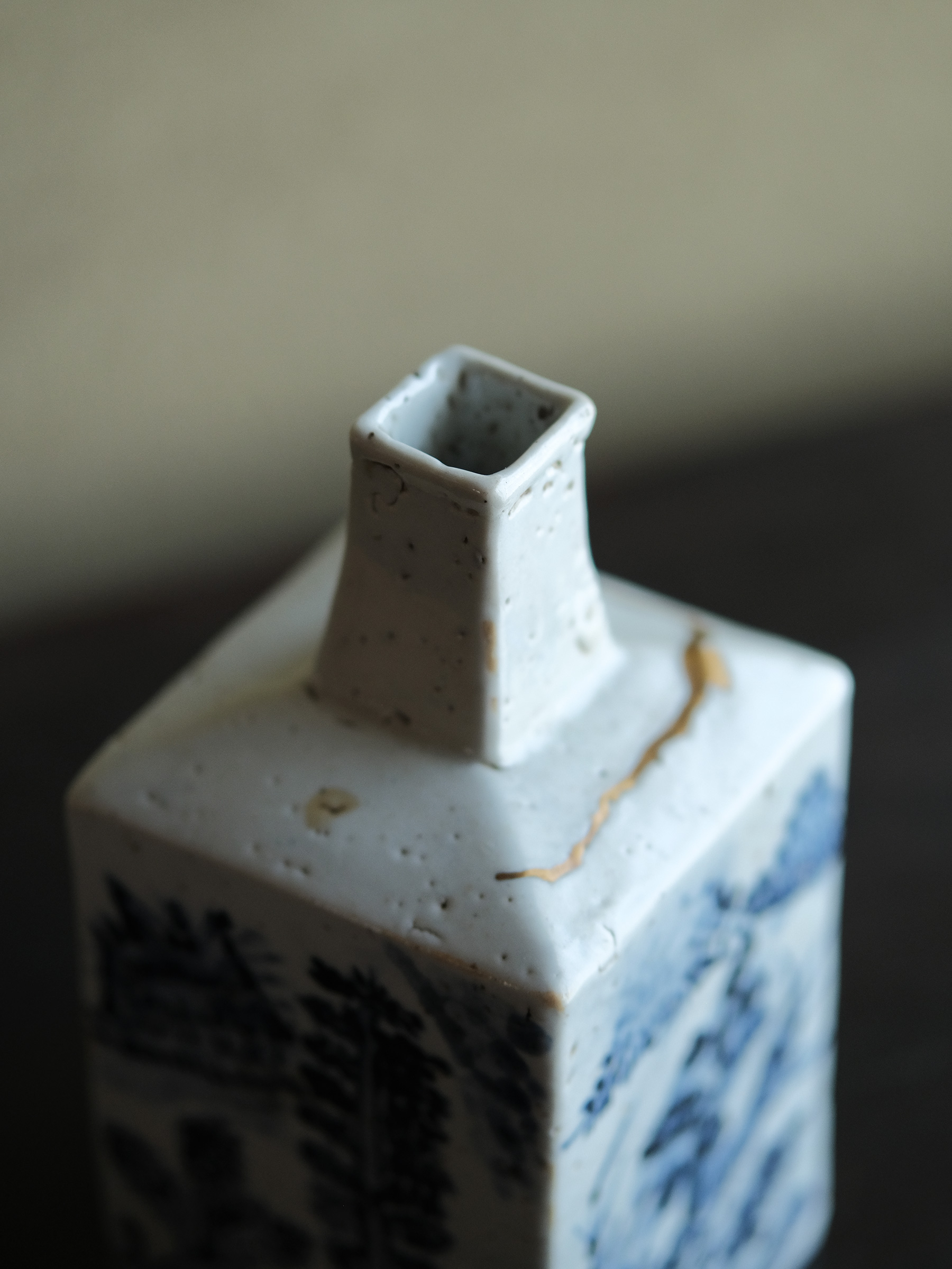 底部脇の窯割れは構造由来のもので、民窯の角瓶にしばしば見られる。漏れはなく、酒器として実用可能。肩部の窯割れには金繕いが施されている。保存箱付き。
