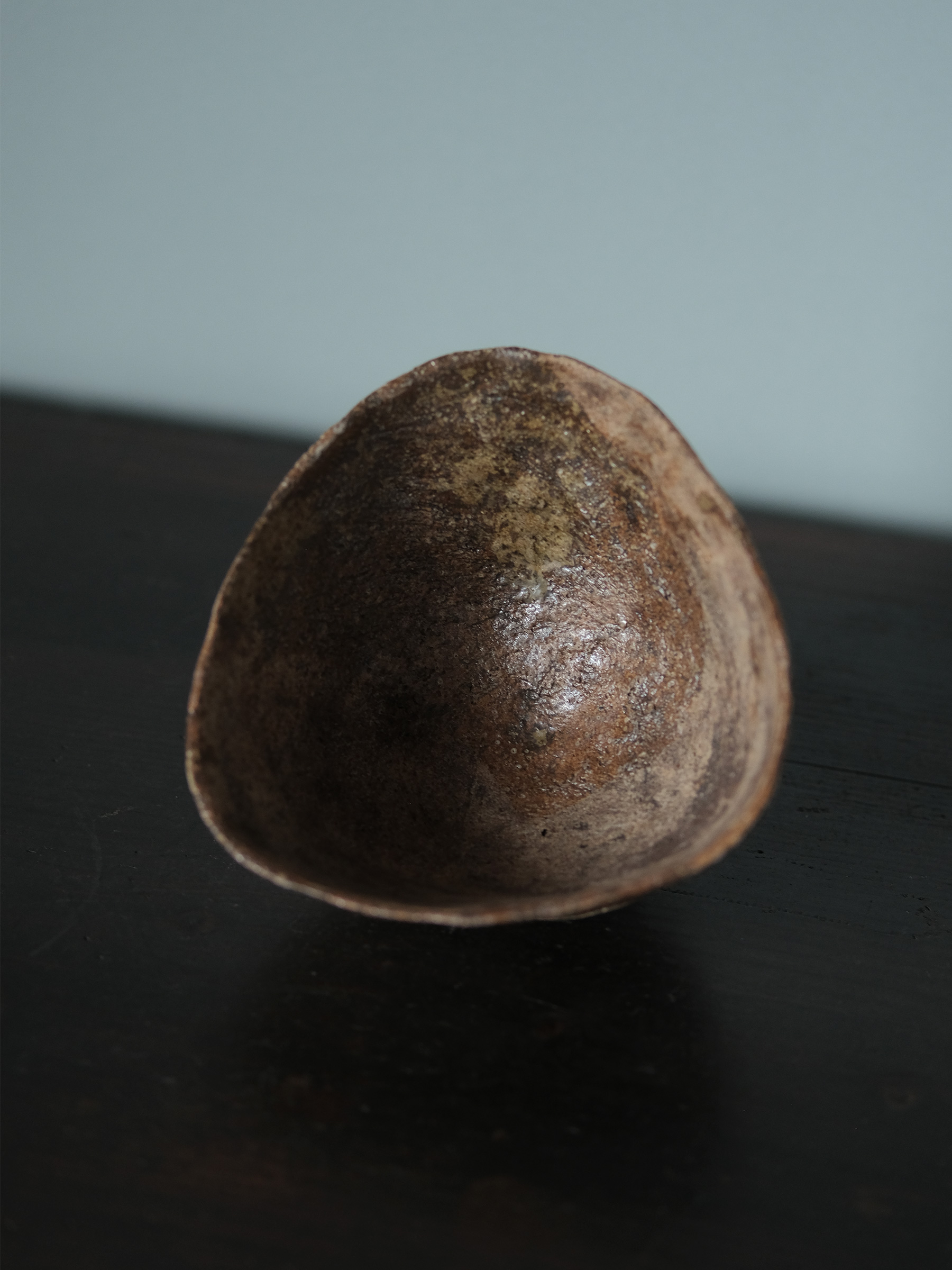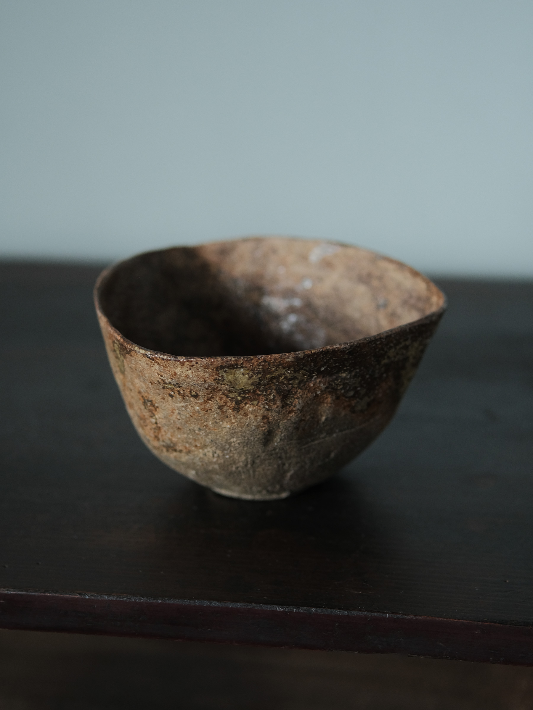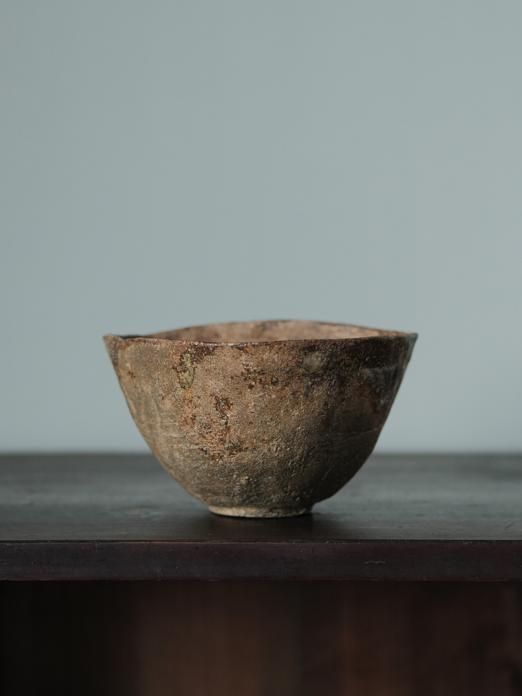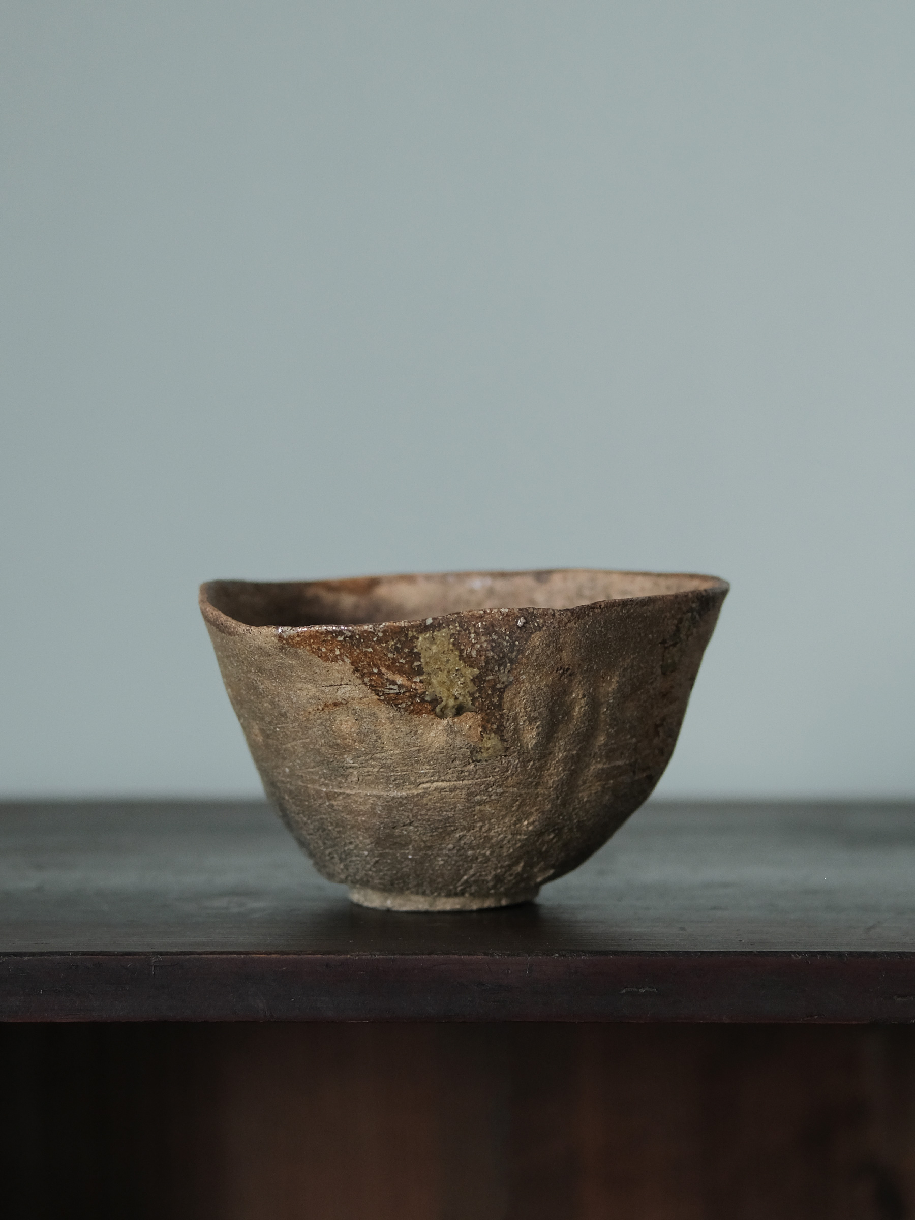 安土桃山〜江戸時代初期に焼かれた古伊賀の茶碗。轆轤挽きののち三角に歪ませた、深く切り立つ器体を成し、腰回りには大胆な箆削りの痕がめぐる。一部に降りかかった自然釉が景色を作り、素地を剥き出しにする。
