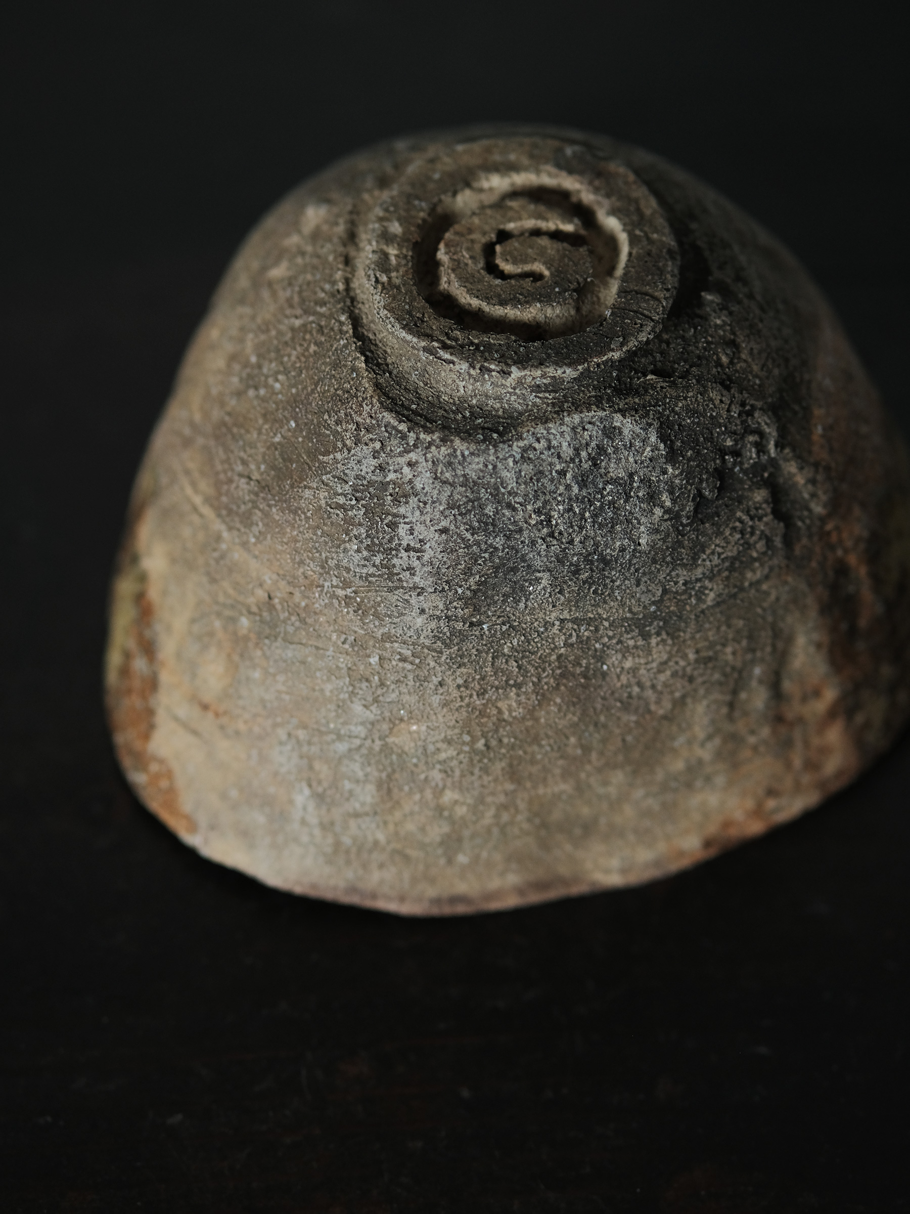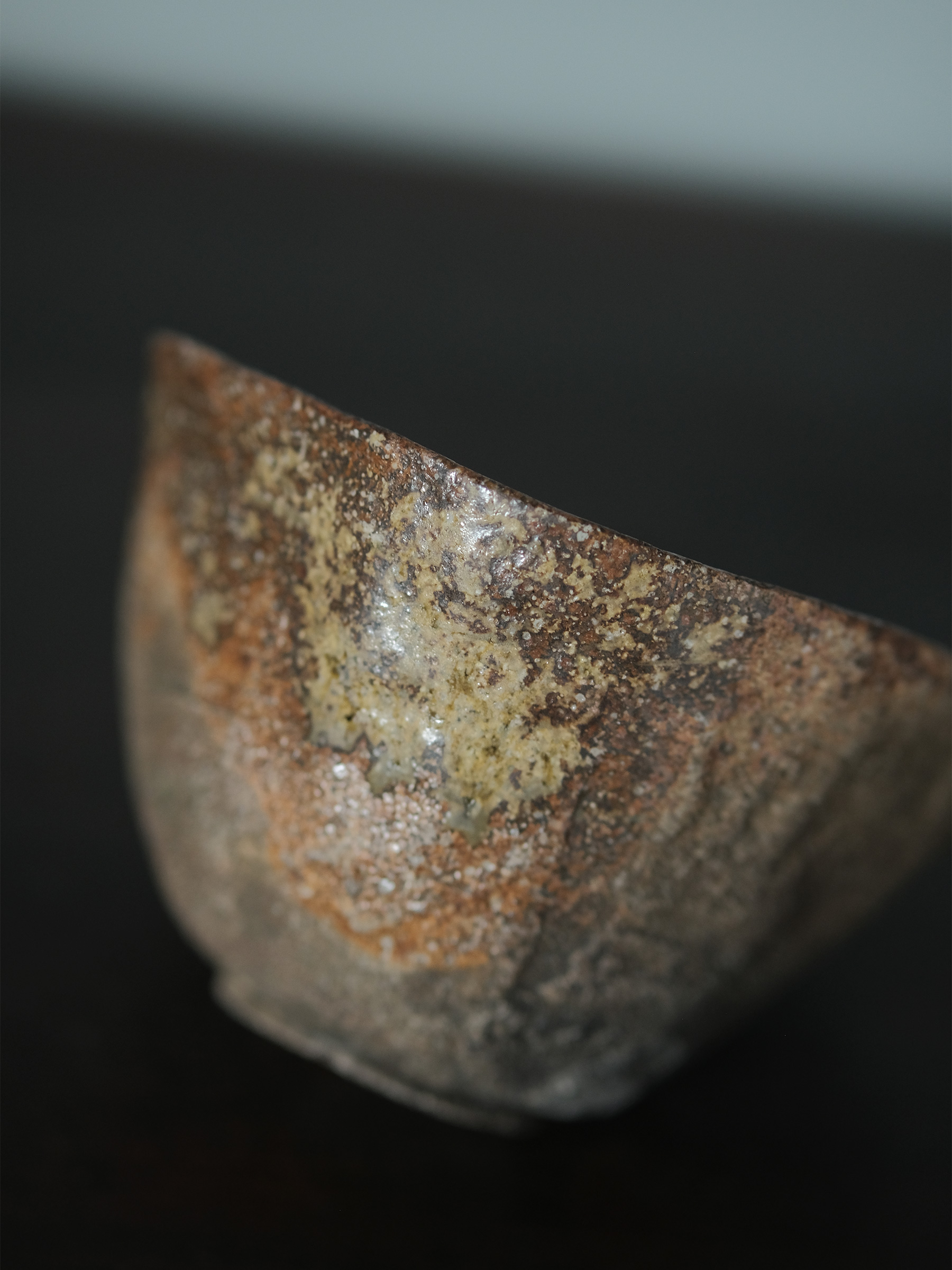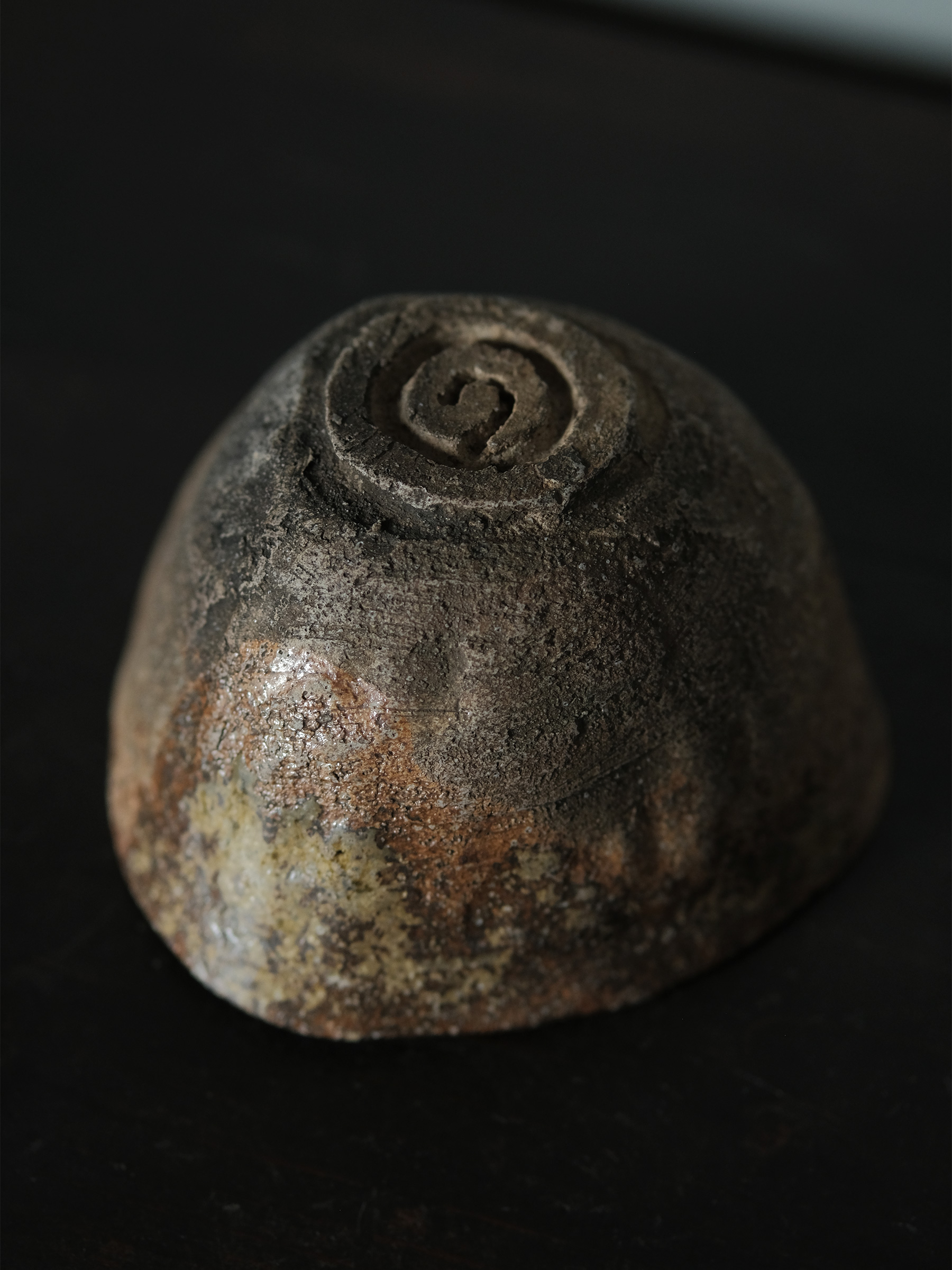 三重県伊賀の地で焼かれる伊賀焼は、中世古窯に端を発し、安土桃山期に領主・筒井定次や藤堂高虎の庇護、さらに古田織部ら茶人の美意識を受けて、「破格」の茶陶へと展開した。本作もその美学を体現した作例で、比較的薄造りながらも、伊賀特有の粘土質の密度によりずっしりとした重厚感を感じさせる。「歪み」と「焦げ」を極めた、豪胆にして風格ある一碗。
