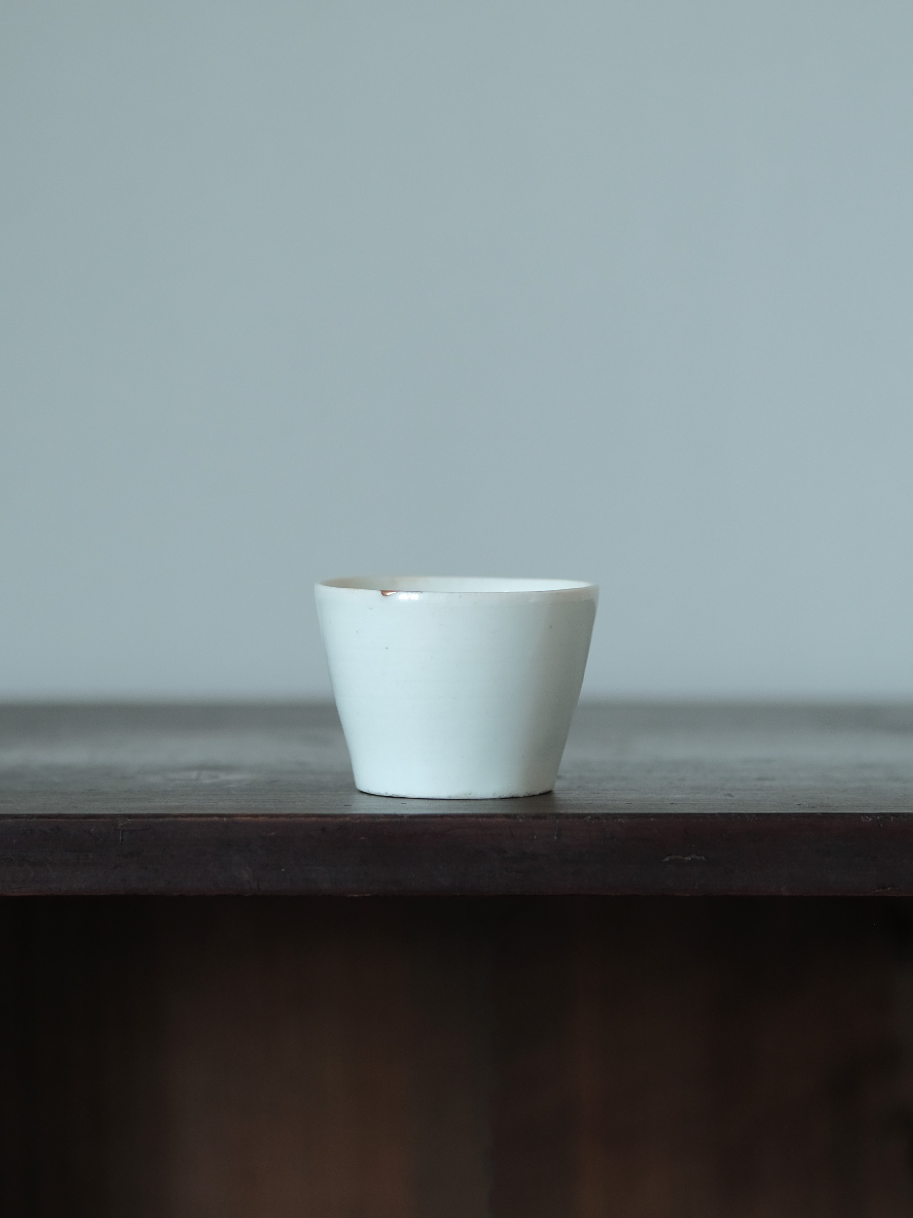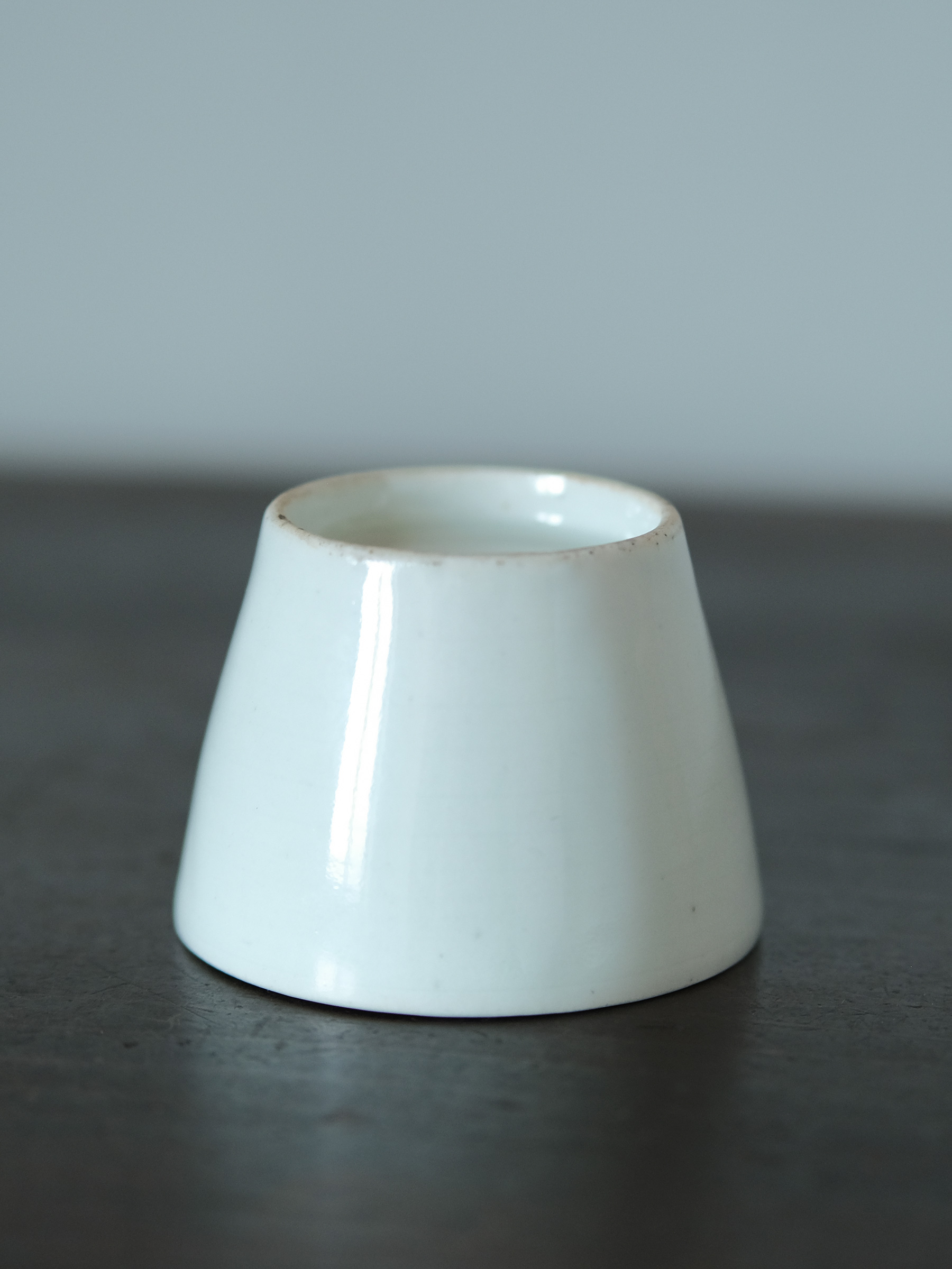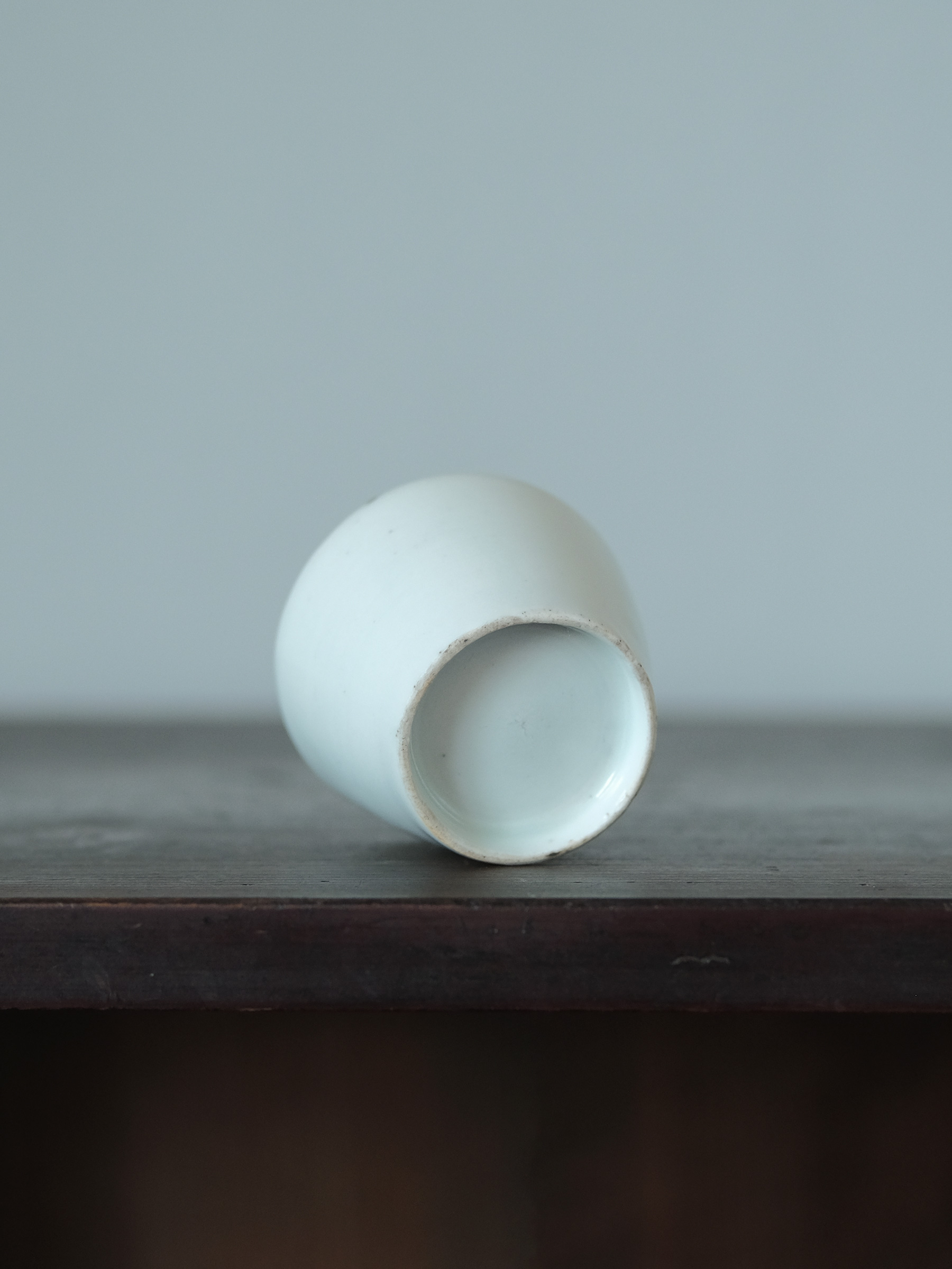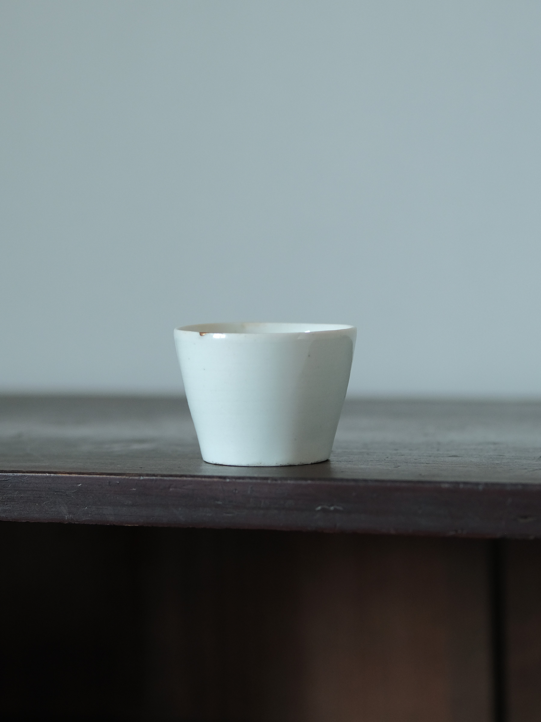 江戸時代中期に長与窯で焼かれた白磁の猪口。小ぶりで端正な器体を成し、澄んだ白のなかにほのかな青みを帯びる。長与窯は波佐見窯の脇窯として、日常雑器を中心に波佐見と同種の器を焼成した。本作は一般的な蕎麦猪口より一回り小さく、無地の白磁猪口としては稀少な寸法。日々の晩酌に好適な、実用本位の美しさが宿る一客。