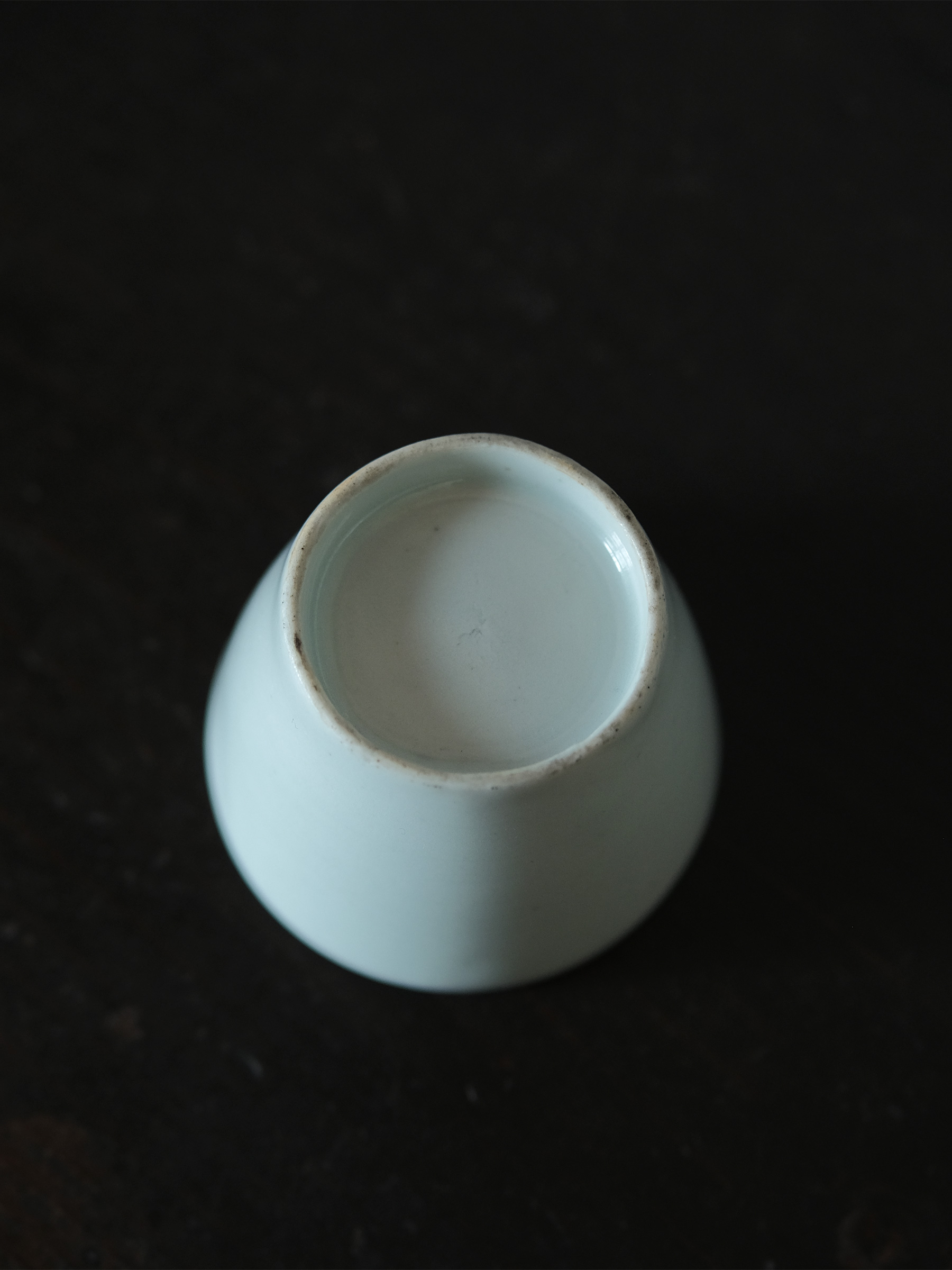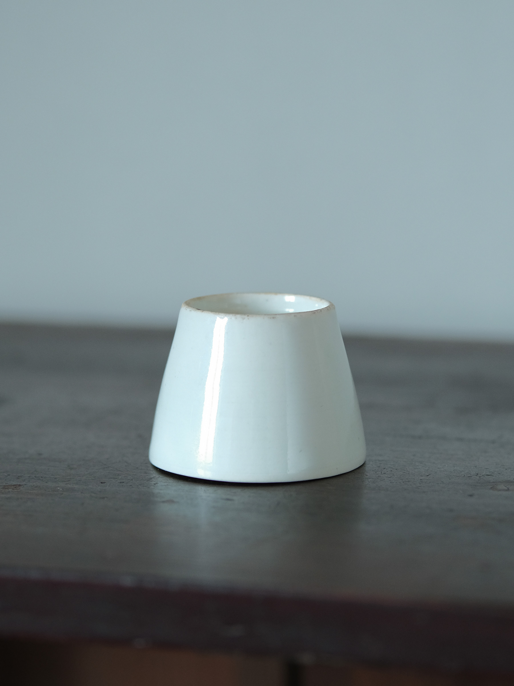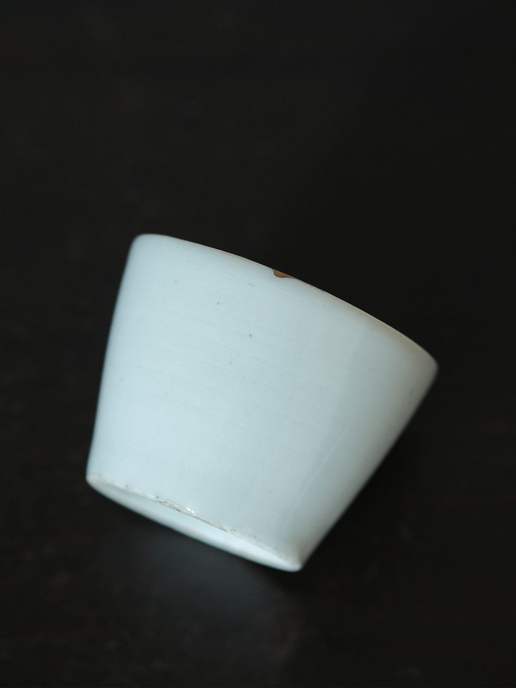 江戸時代中期に長与窯で焼かれた白磁の猪口。小ぶりで端正な器体を成し、澄んだ白のなかにほのかな青みを帯びる。長与窯は波佐見窯の脇窯として、日常雑器を中心に波佐見と同種の器を焼成した。本作は一般的な蕎麦猪口より一回り小さく、無地の白磁猪口としては稀少な寸法。日々の晩酌に好適な、実用本位の美しさが宿る一客。