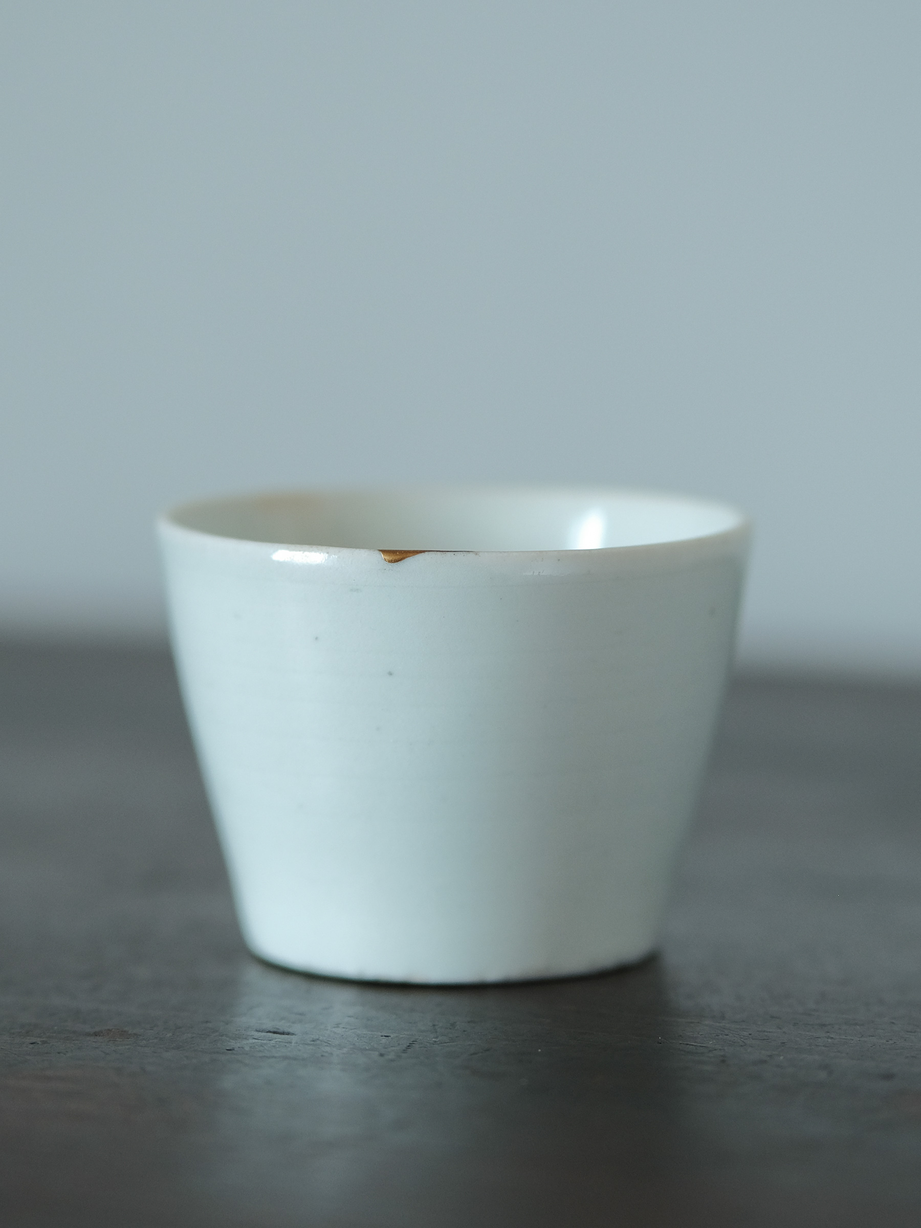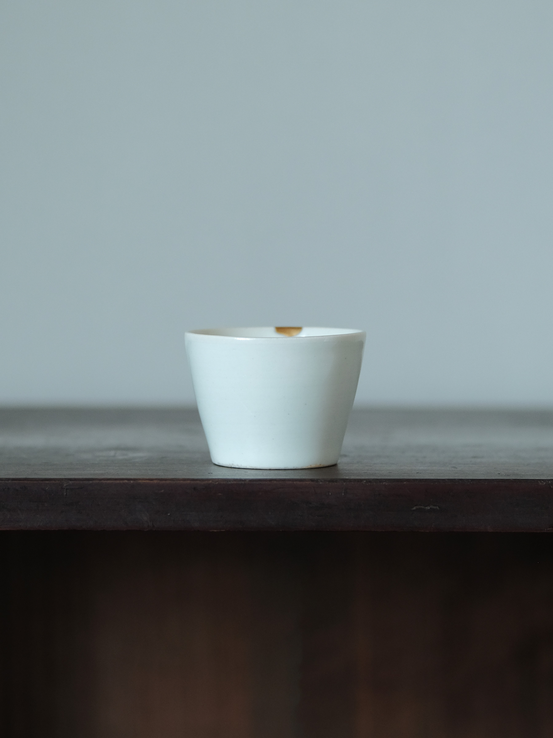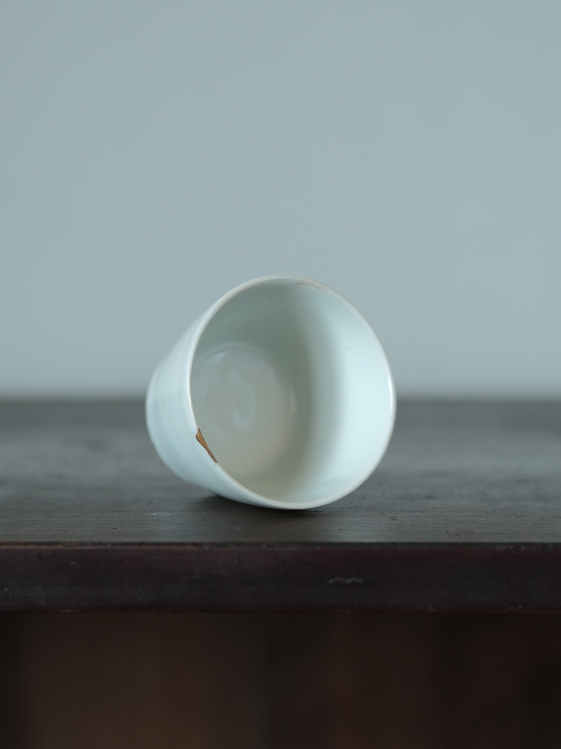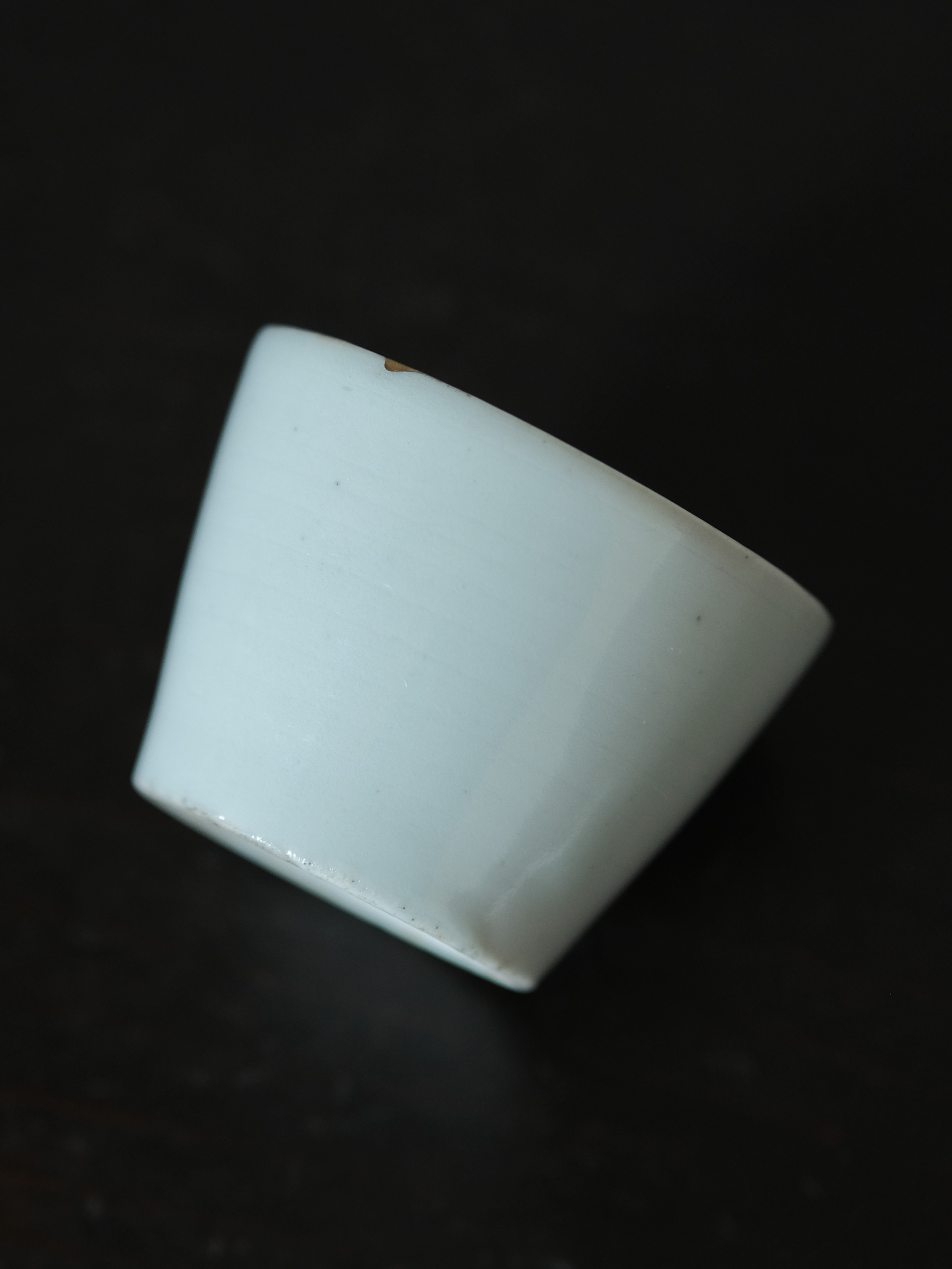 江戸時代中期に長与窯で焼かれた白磁の猪口。小ぶりで端正な器体を成し、澄んだ白のなかにほのかな青みを帯びる。長与窯は波佐見窯の脇窯として、日常雑器を中心に波佐見と同種の器を焼成した。本作は一般的な蕎麦猪口より一回り小さく、無地の白磁猪口としては稀少な寸法。日々の晩酌に好適な、実用本位の美しさが宿る一客。