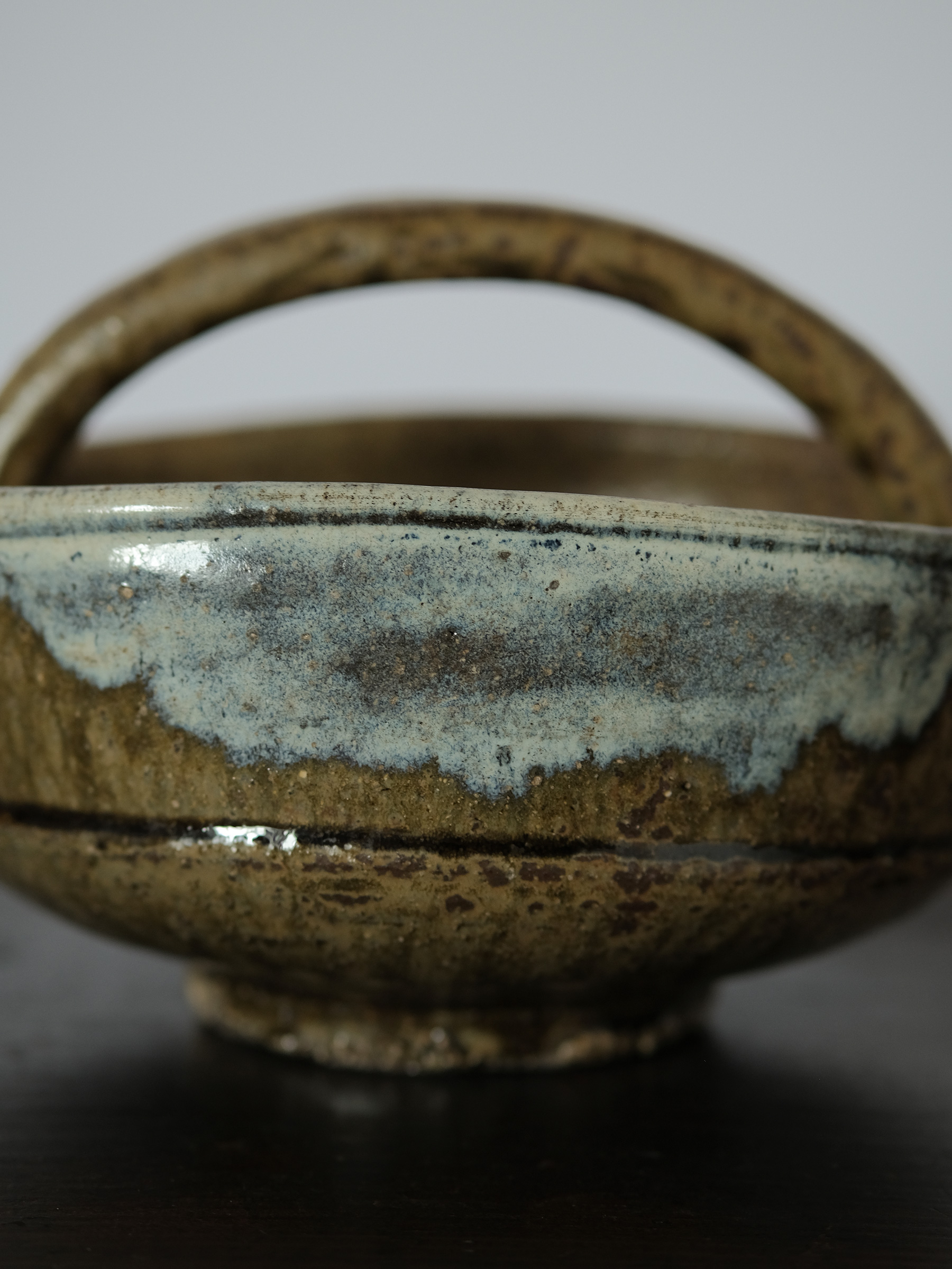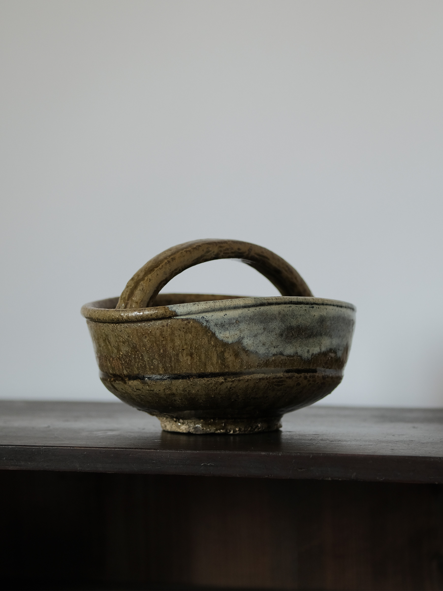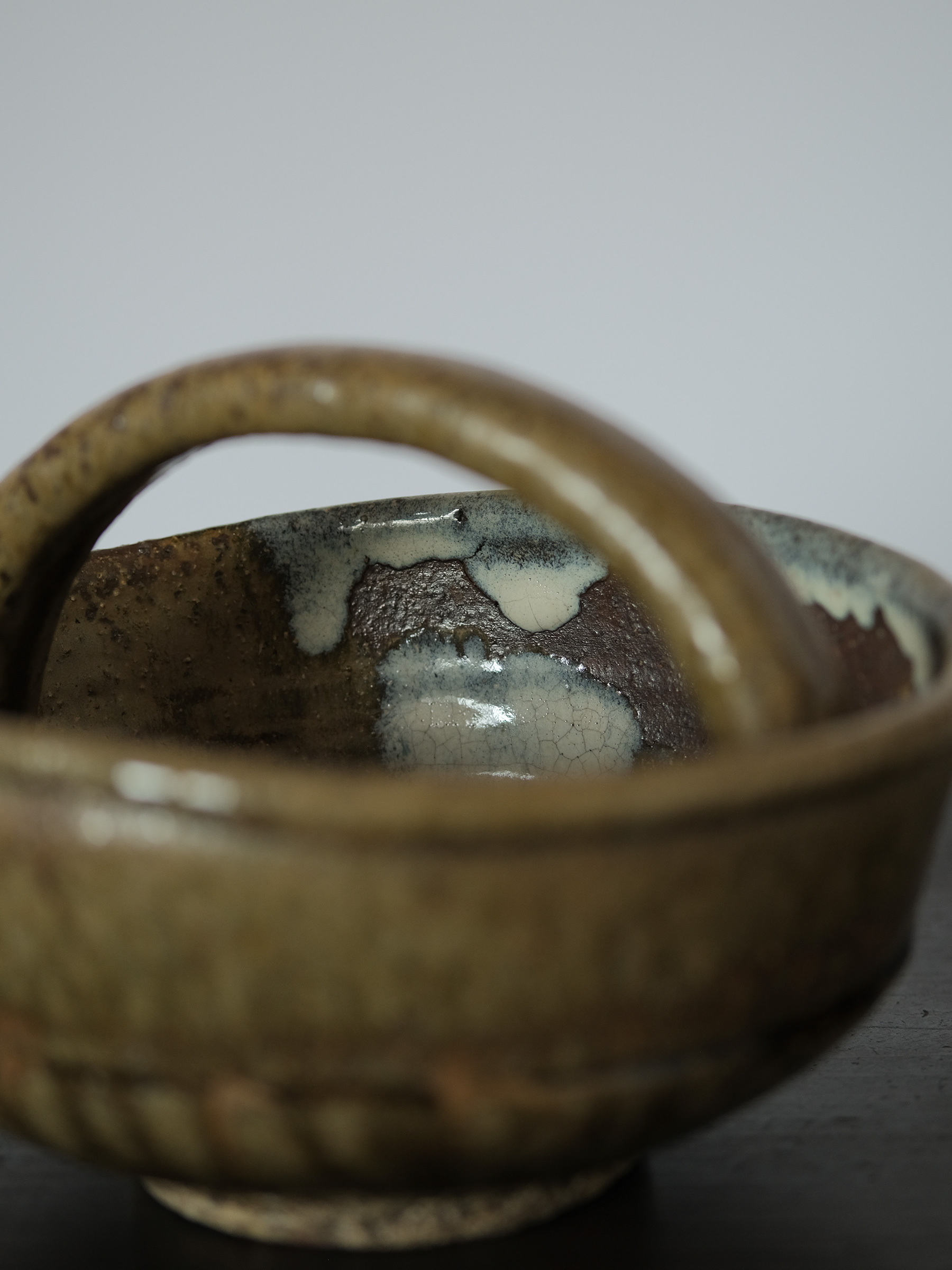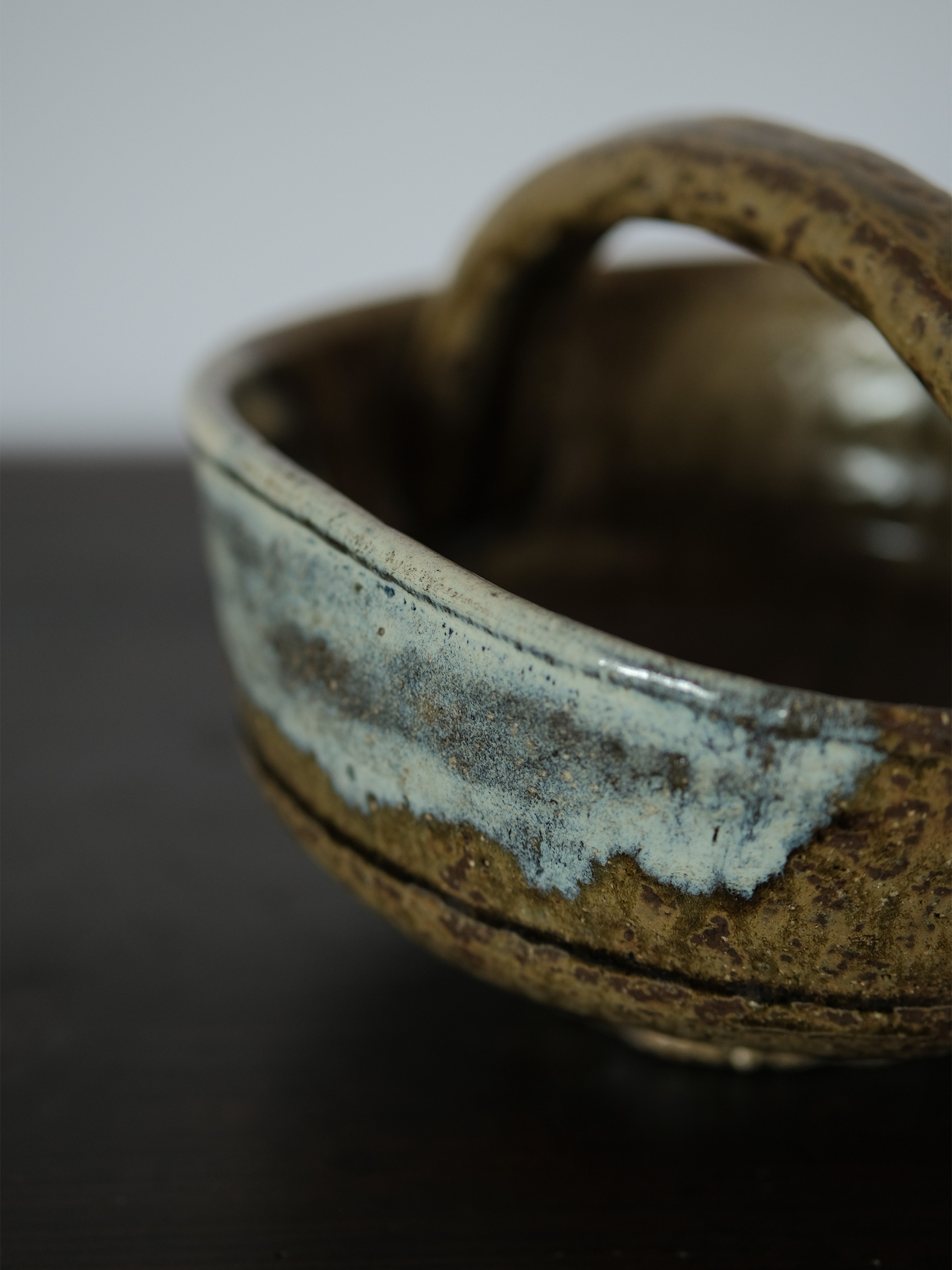 江戸時代初期に焼かれた高取焼の手付鉢。黒田藩御用窯として筑前に置かれた内ヶ磯窯の所産。腰に力強い張りを持たせた大ぶりの器体に、口縁内側から肉厚の輪形手を渡す。飴釉と藁灰釉を大らかに掛け分け、後者は見込みへと自然に流下して景色を成す。高台周辺には砂・灰の溶着が顕著で、重ね焼きの敷砂ではなく、窯内の熱気を器が直に受けた痕跡として読める。御用窯の格式と古高取特有の豪快な釉感とが相俟って茶陶としての密度を成す、内ヶ磯の気風を体現した一作。