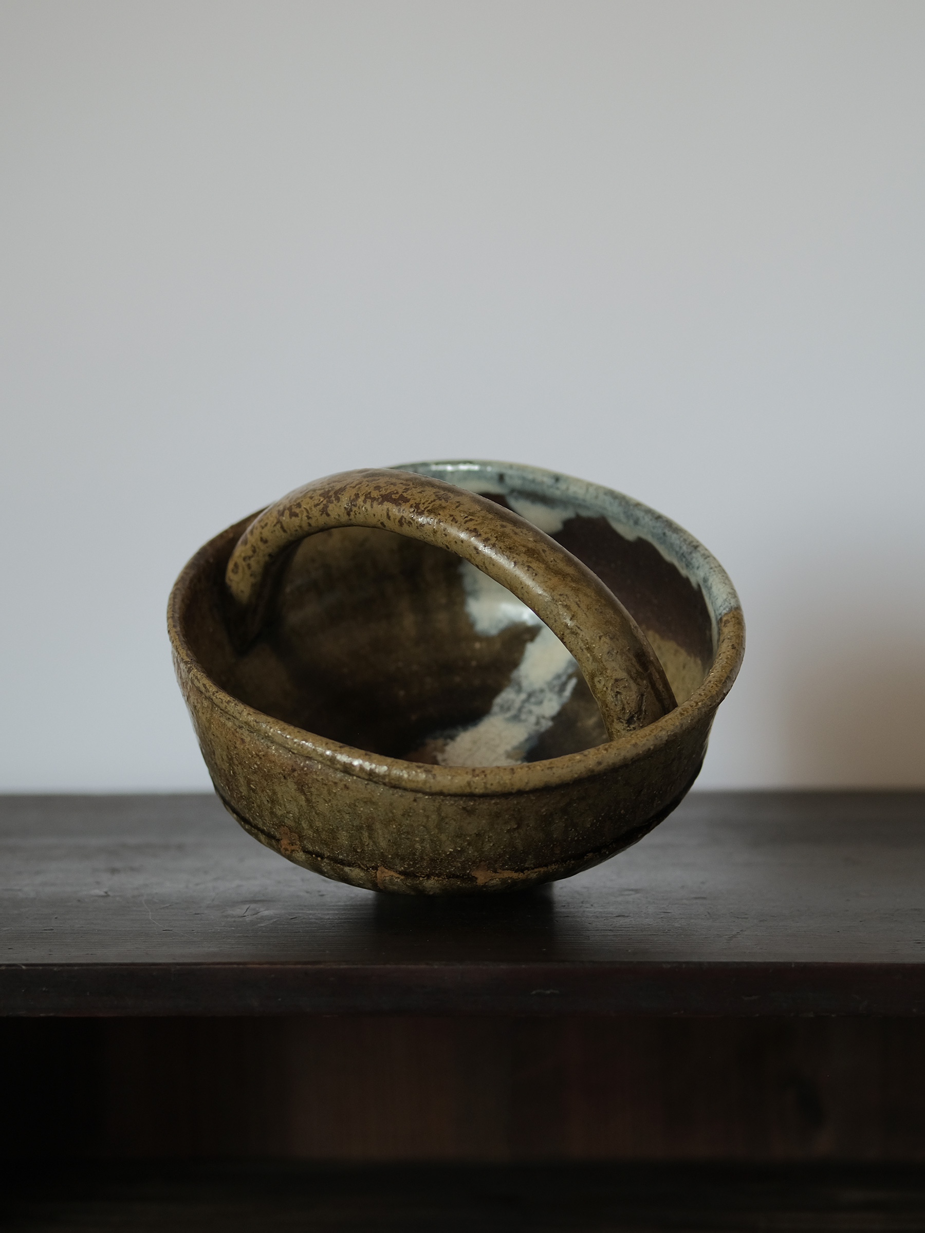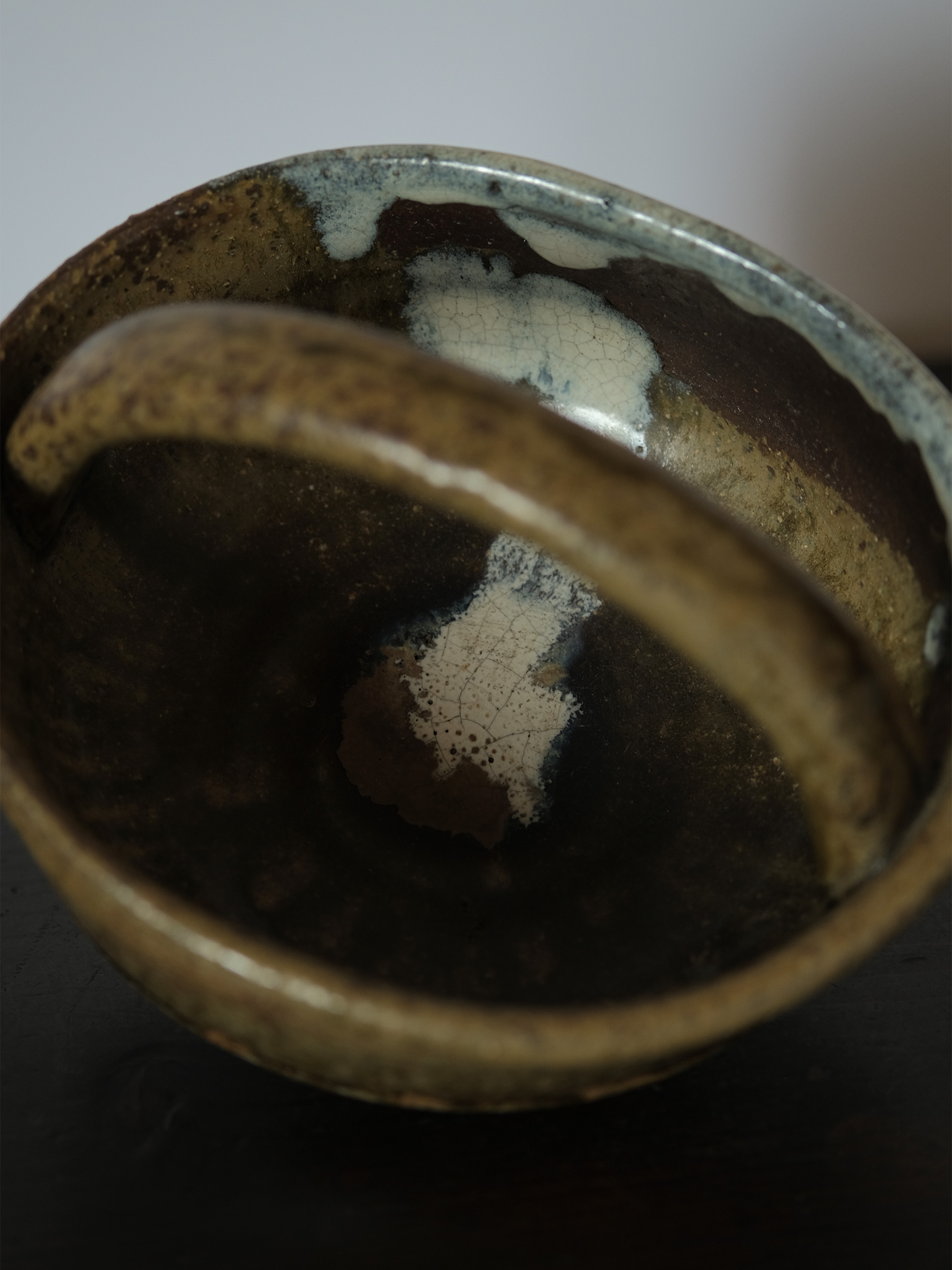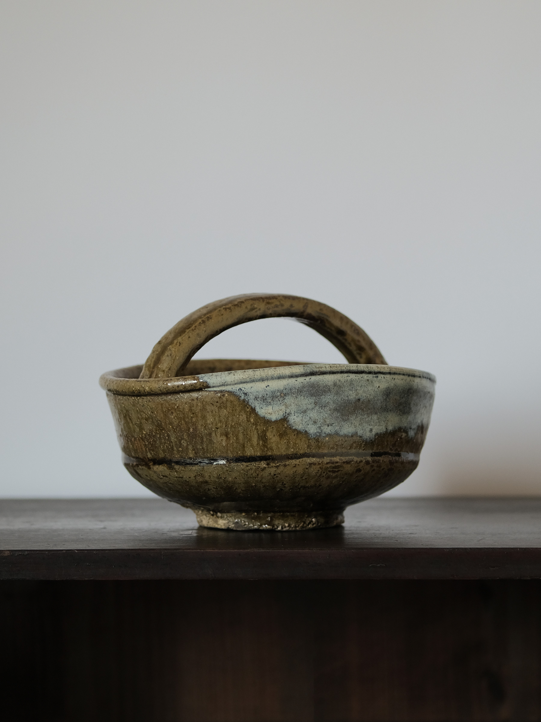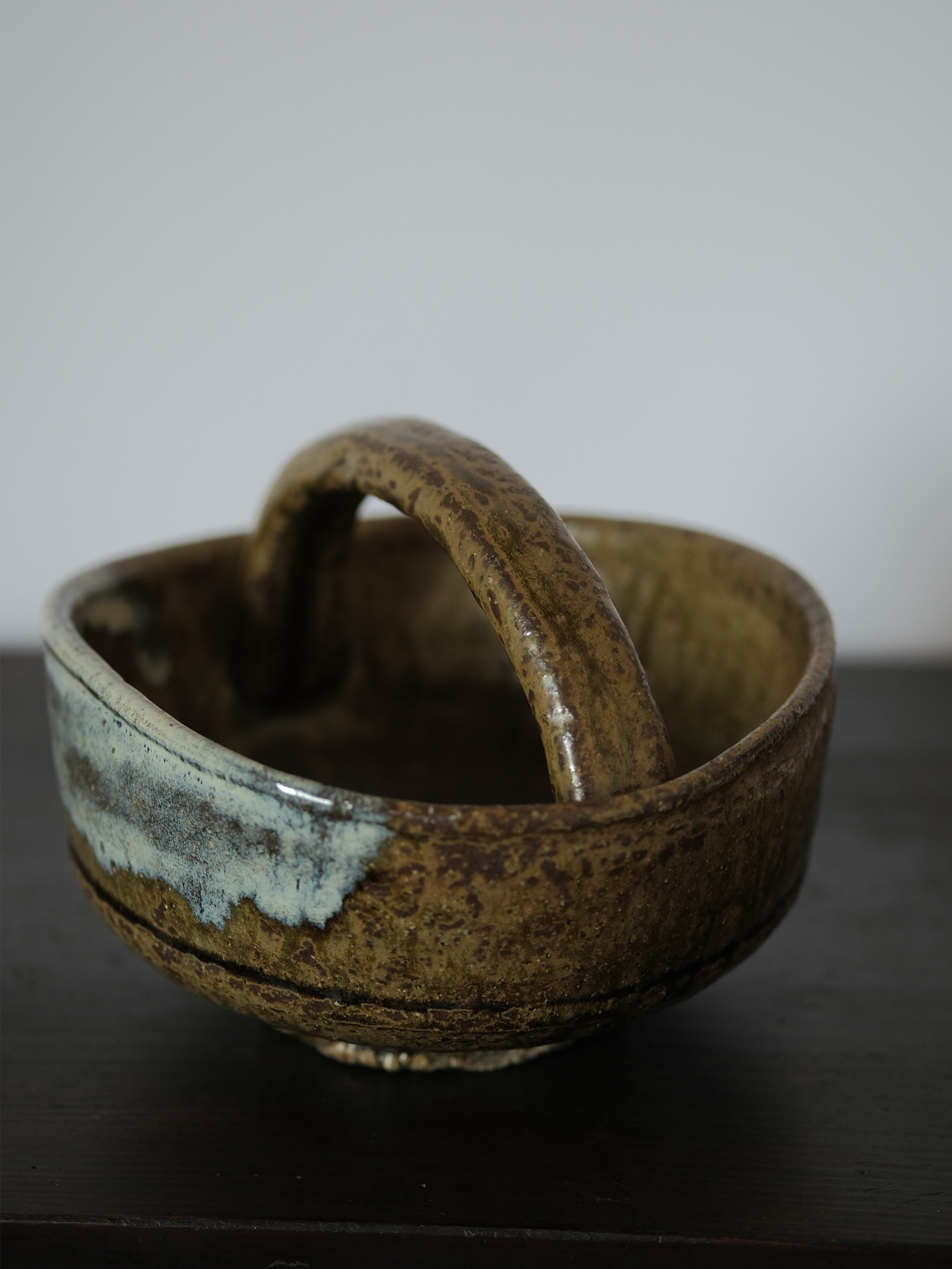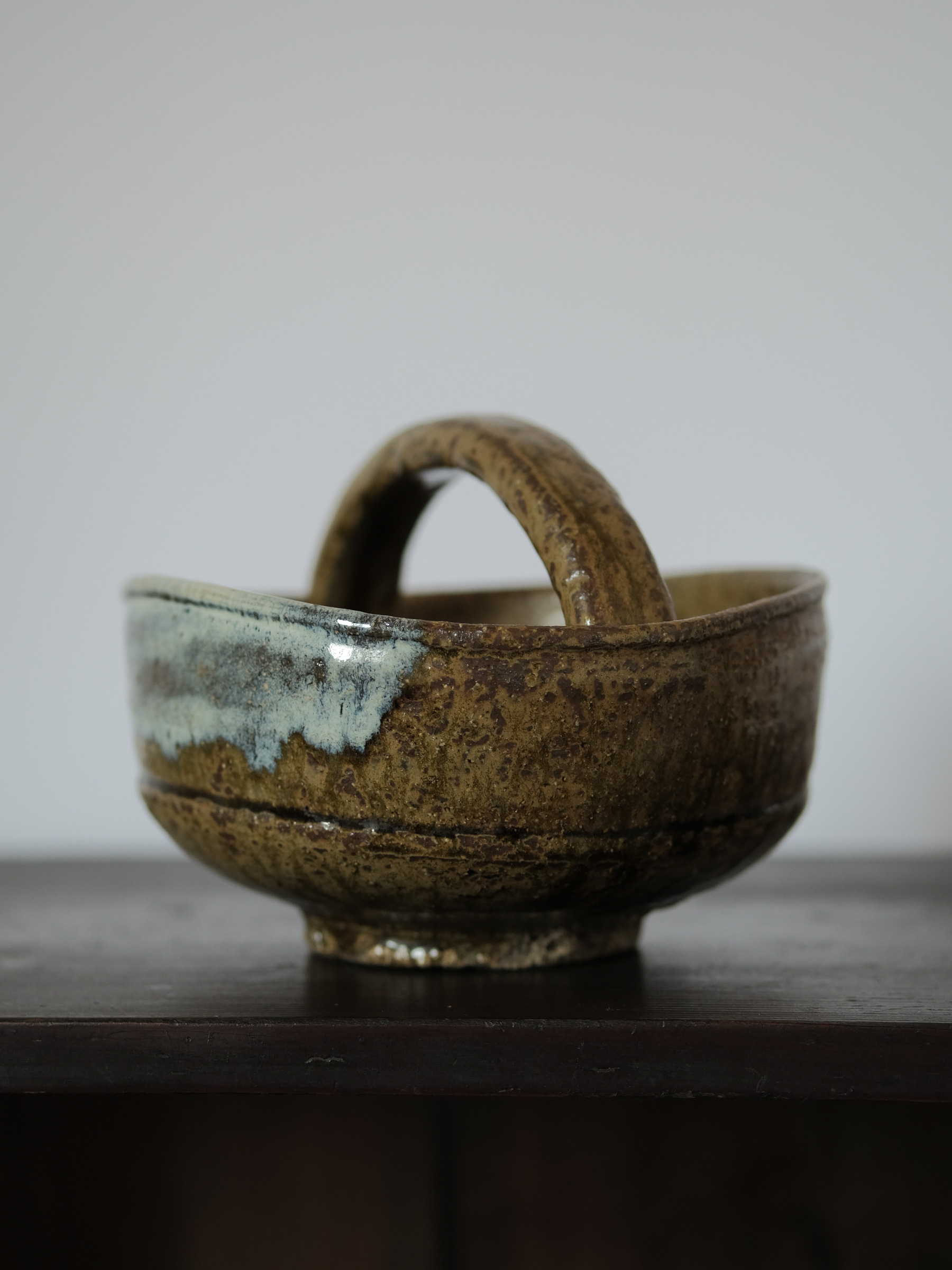 江戸時代初期に焼かれた高取焼の手付鉢。黒田藩御用窯として筑前に置かれた内ヶ磯窯の所産。腰に力強い張りを持たせた大ぶりの器体に、口縁内側から肉厚の輪形手を渡す。飴釉と藁灰釉を大らかに掛け分け、後者は見込みへと自然に流下して景色を成す。高台周辺には砂・灰の溶着が顕著で、重ね焼きの敷砂ではなく、窯内の熱気を器が直に受けた痕跡として読める。御用窯の格式と古高取特有の豪快な釉感とが相俟って茶陶としての密度を成す、内ヶ磯の気風を体現した一作。