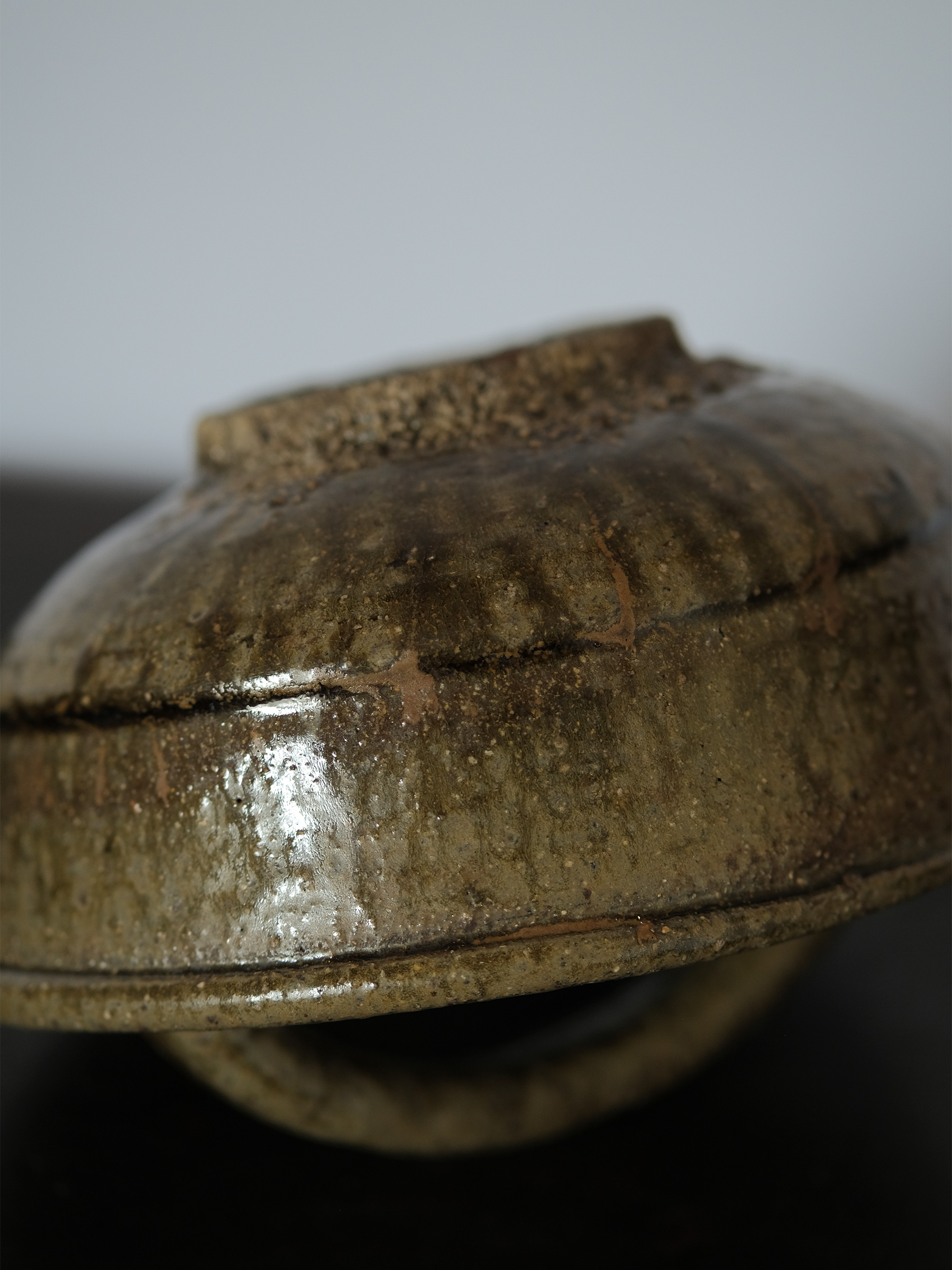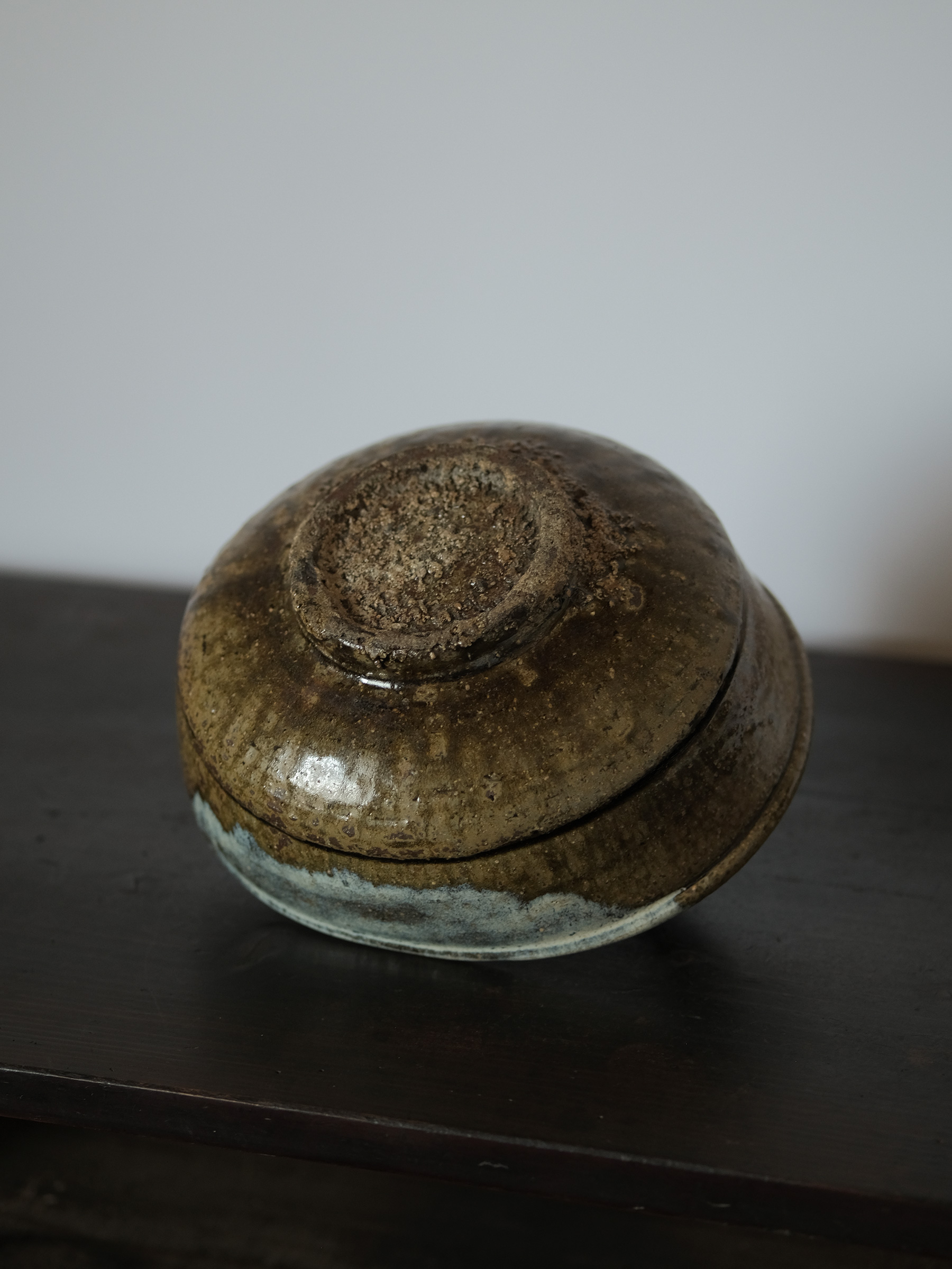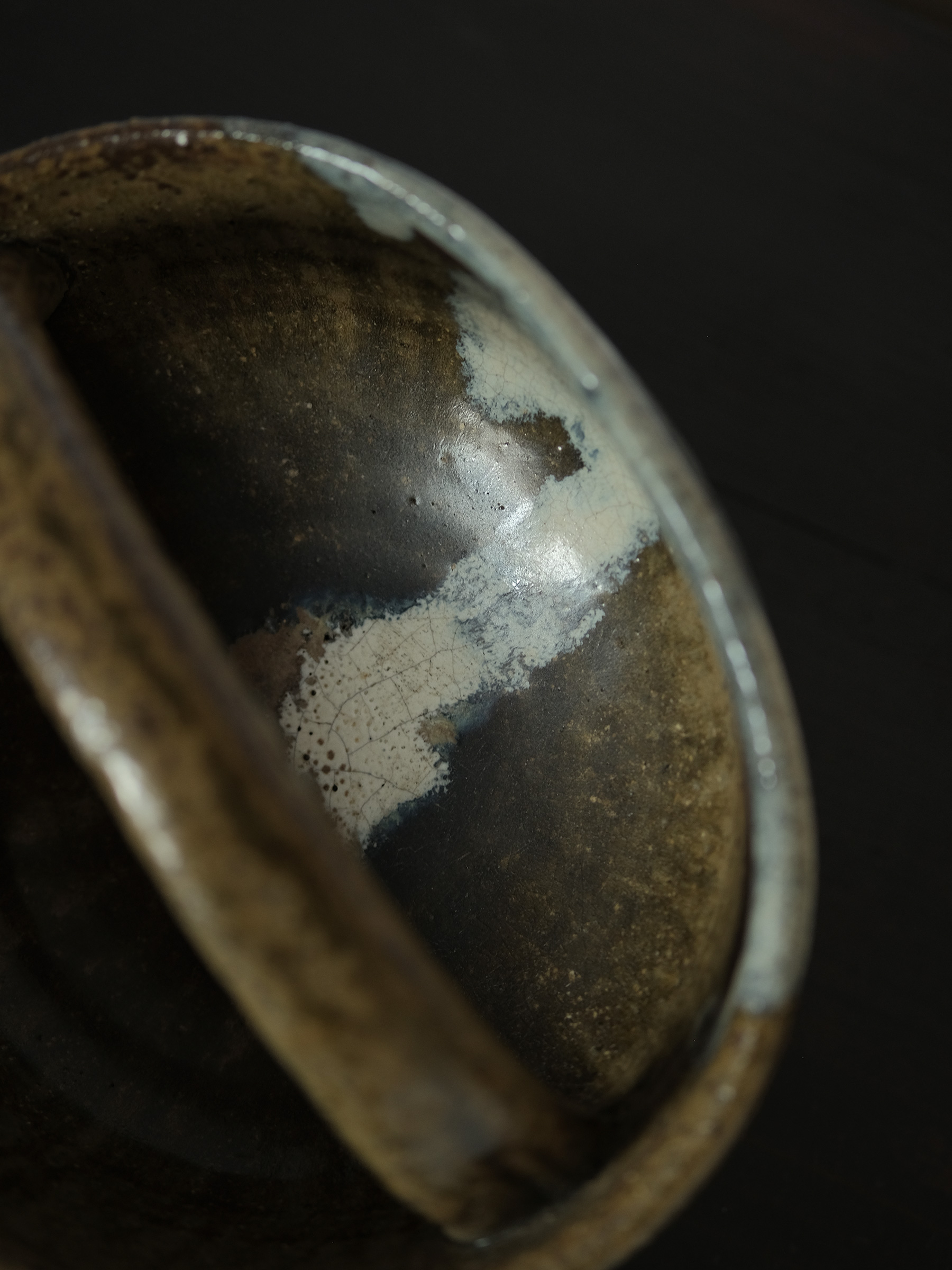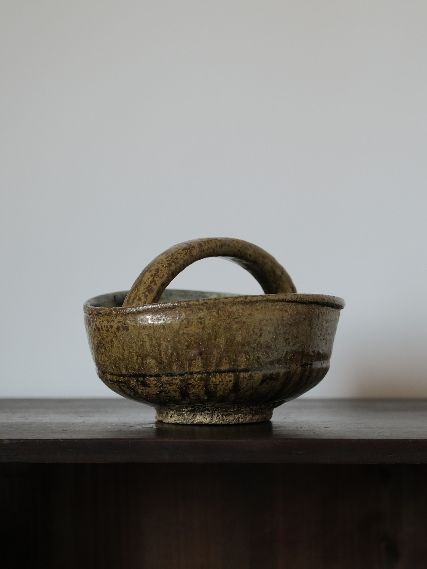 江戸時代初期に焼かれた高取焼の手付鉢。黒田藩御用窯として筑前に置かれた内ヶ磯窯の所産。腰に力強い張りを持たせた大ぶりの器体に、口縁内側から肉厚の輪形手を渡す。飴釉と藁灰釉を大らかに掛け分け、後者は見込みへと自然に流下して景色を成す。高台周辺には砂・灰の溶着が顕著で、重ね焼きの敷砂ではなく、窯内の熱気を器が直に受けた痕跡として読める。御用窯の格式と古高取特有の豪快な釉感とが相俟って茶陶としての密度を成す、内ヶ磯の気風を体現した一作。