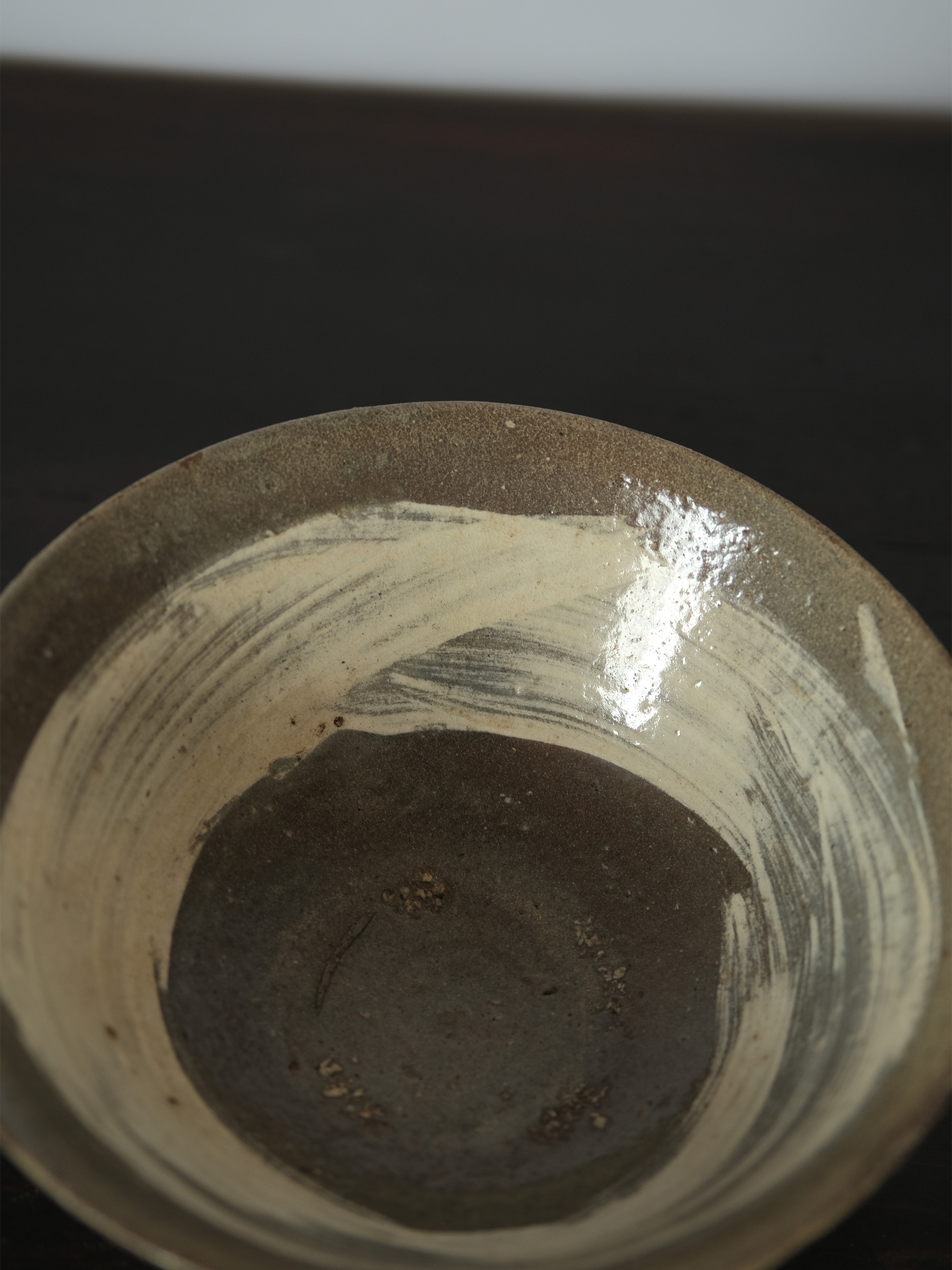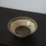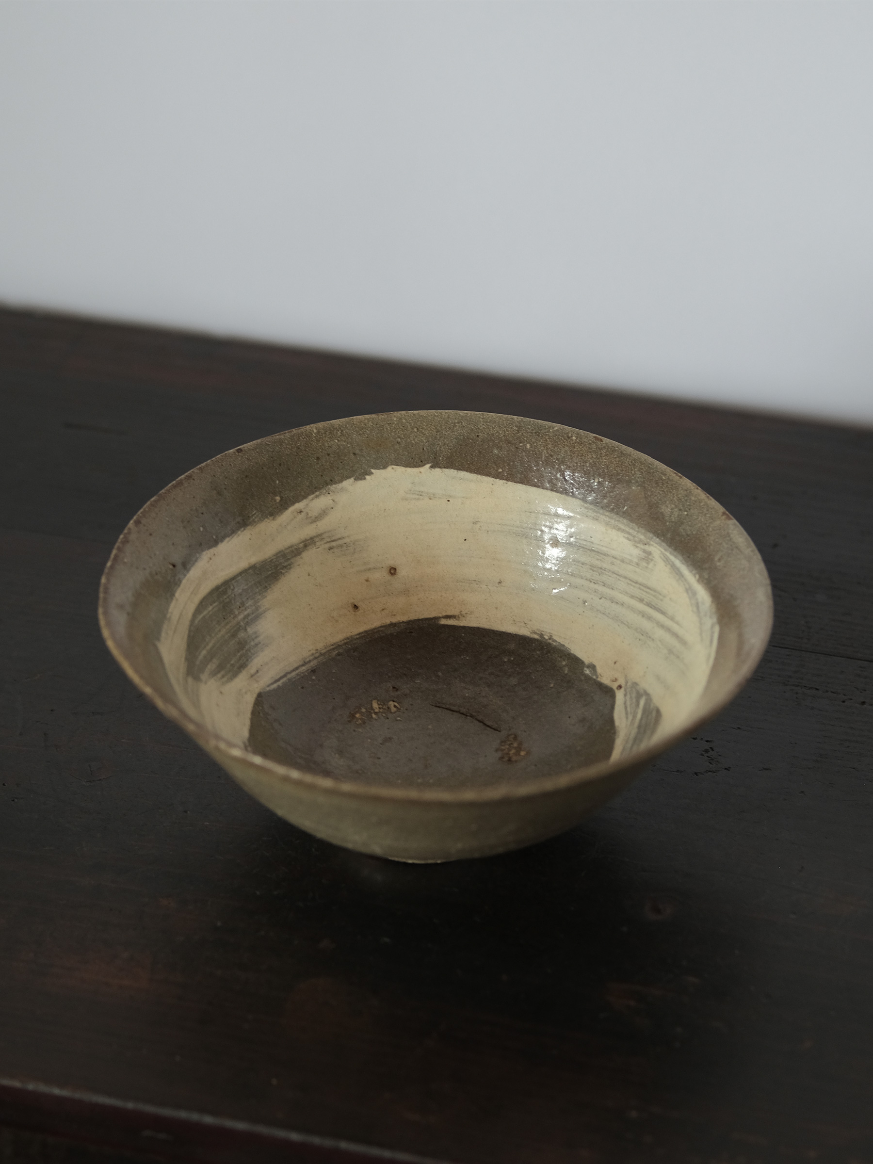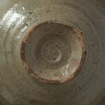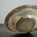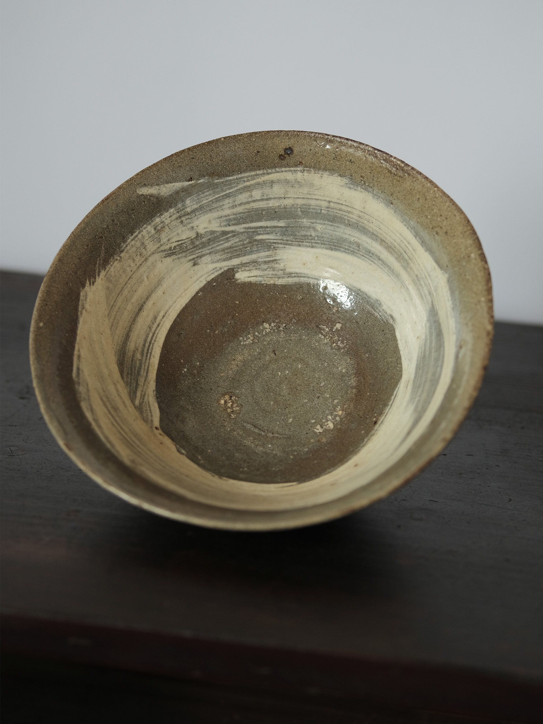 李氏朝鮮時代初期、鶏龍山窯で焼かれた粉青沙器の鉢。砂目の残る見込み、小さく引き締まった高台、釉薬の鋭い光沢など、鶏龍山窯の典型的な特徴を示す。見込みに展開する刷毛目は白化粧土を厚く含んだ刷毛の動きそのままに、大きく弧を描いて器面を一周する。外面には焼成中のひっつきが一箇所残り、作為なき点景となっている。鶏龍山粉青の野趣と生命力を体現した一碗。