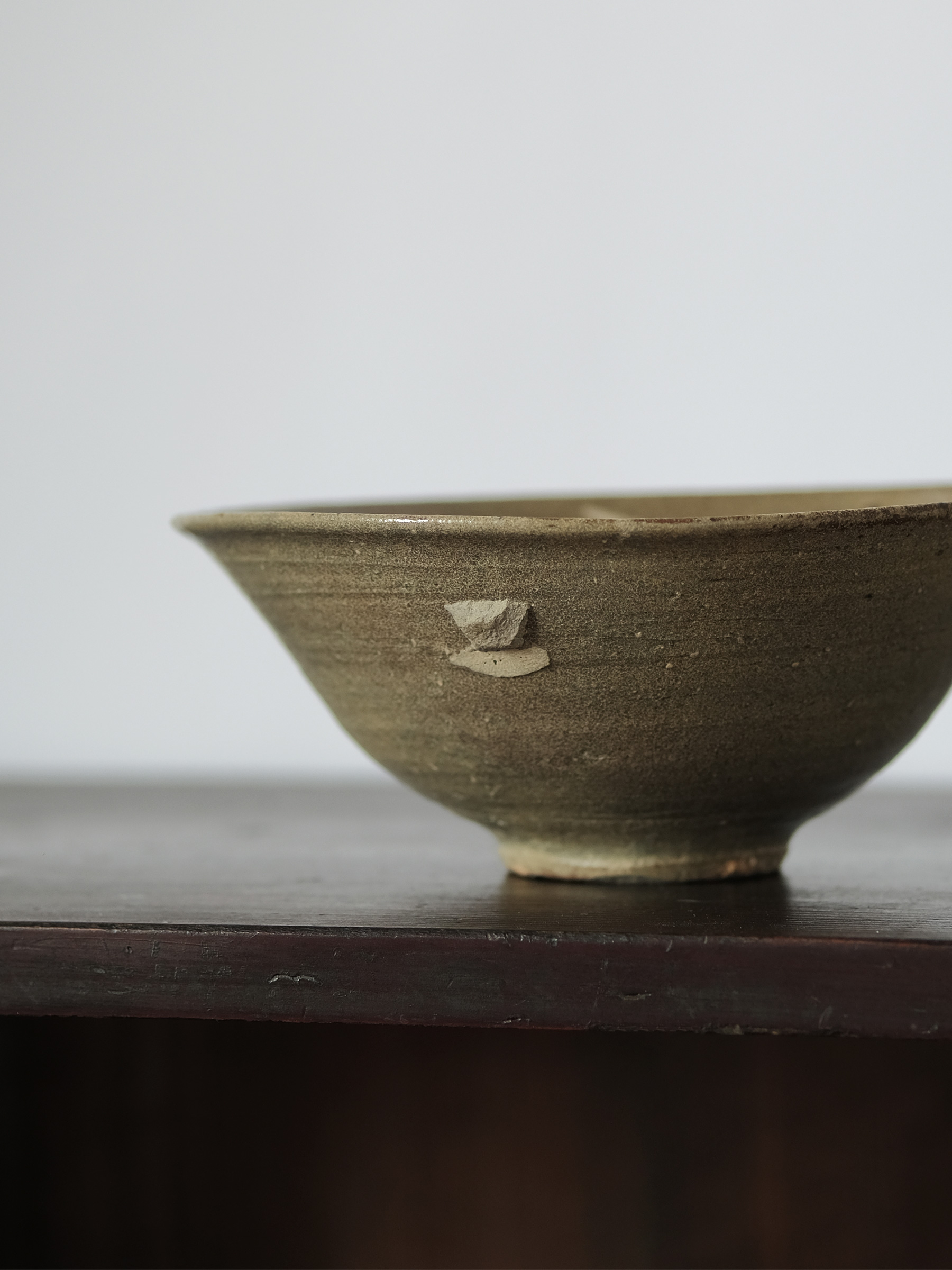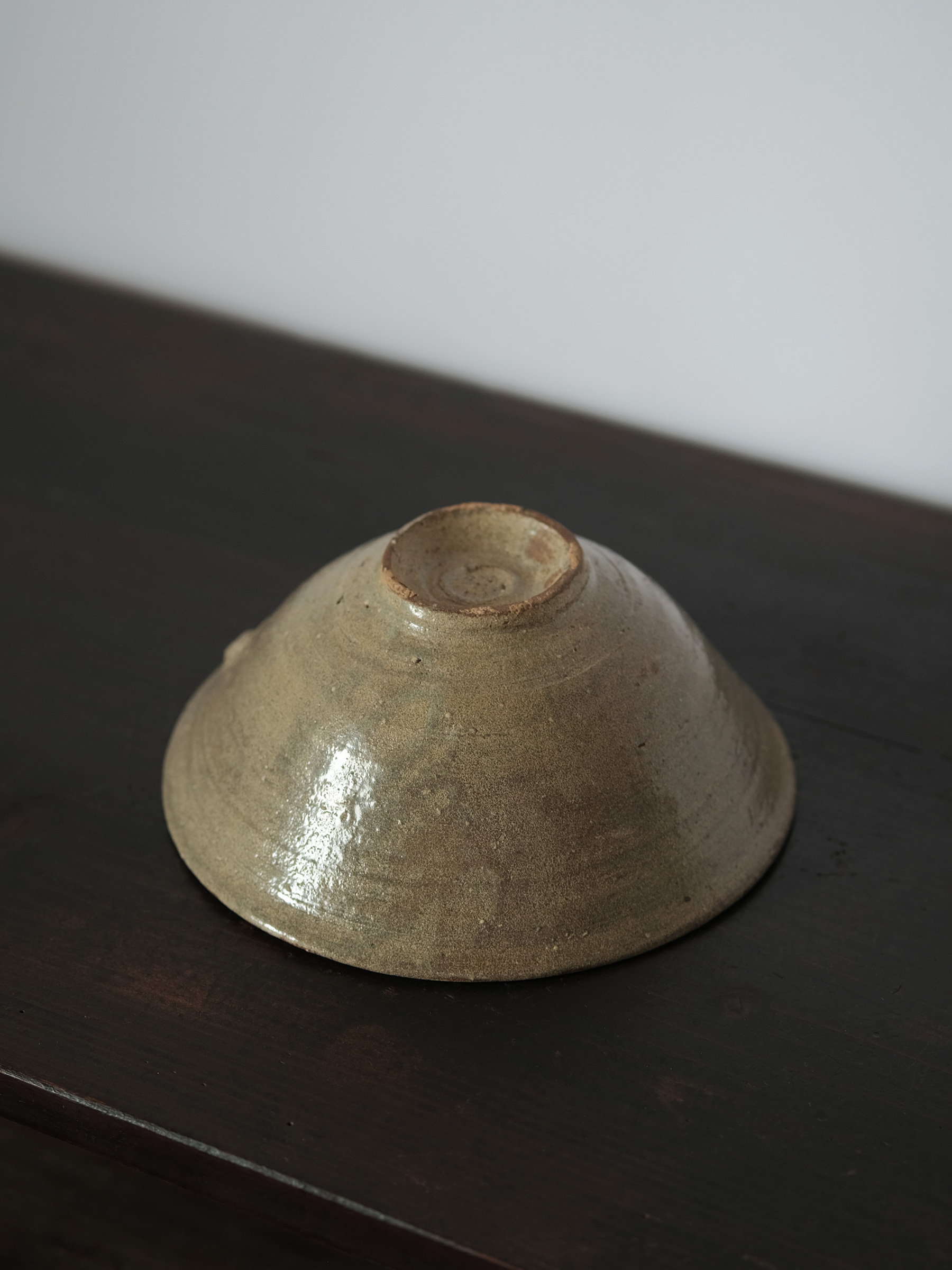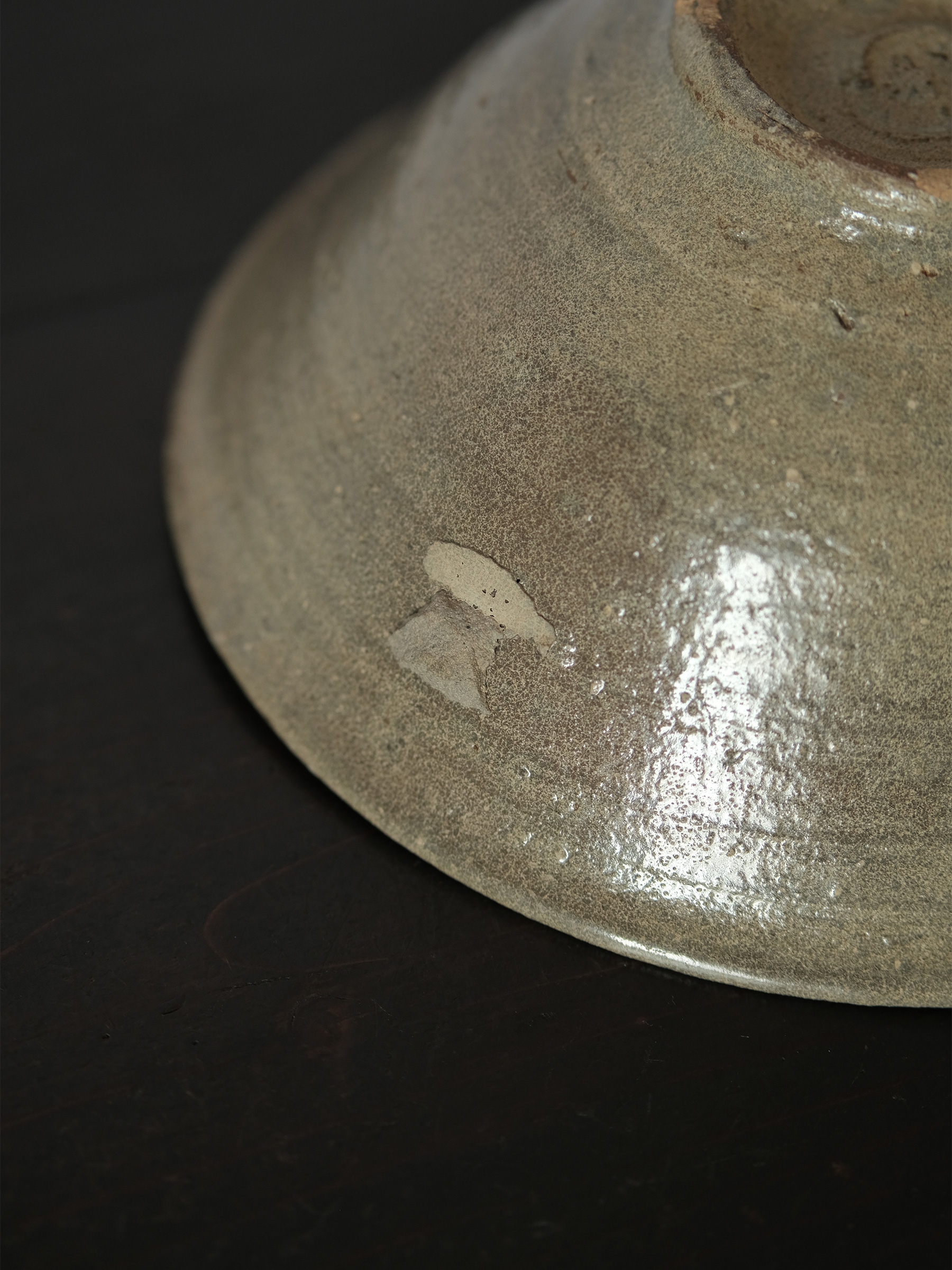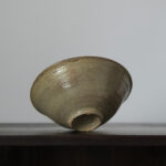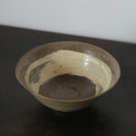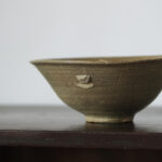李氏朝鮮時代初期、鶏龍山窯で焼かれた粉青沙器の鉢。砂目の残る見込み、小さく引き締まった高台、釉薬の鋭い光沢など、鶏龍山窯の典型的な特徴を示す。見込みに展開する刷毛目は白化粧土を厚く含んだ刷毛の動きそのままに、大きく弧を描いて器面を一周する。外面には焼成中のひっつきが一箇所残り、作為なき点景となっている。鶏龍山粉青の野趣と生命力を体現した一碗。