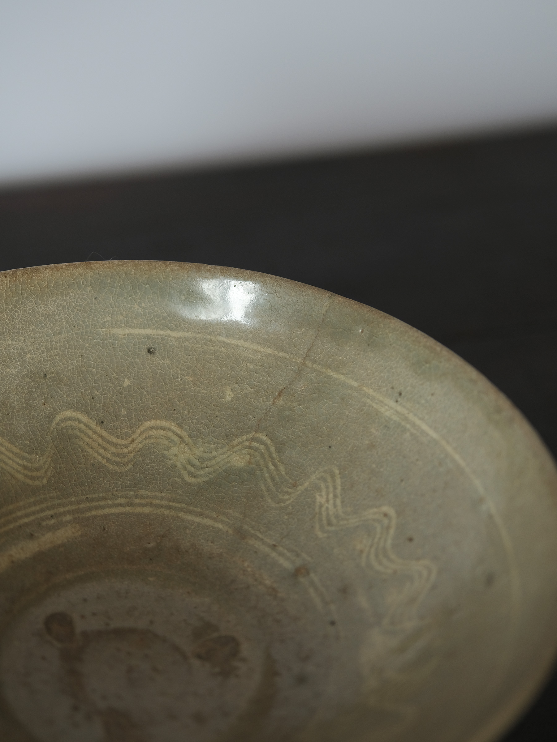 李氏朝鮮時代初期に焼かれた粉青沙器の鉢。僅かに内に抱え込む器形を成し、青灰色の釉薬が全体を包む。見込みの意匠は一見すると刷毛目のようだが、実際には櫛描きによる波状文に白土を擦り込んだ三島の作例である。三島手は印花による花文や幾何文、輪線などの白土象嵌を典型とするが、本作のように波状文を主文様に据えたものは極めて稀。