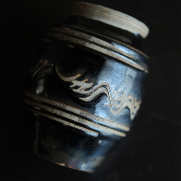 元末〜明朝初期に寧夏で焼かれた双耳小壺。現在の霊武市周辺に所在した窯の産。胴部に櫛目による水波文を施し、黒釉を掛ける。